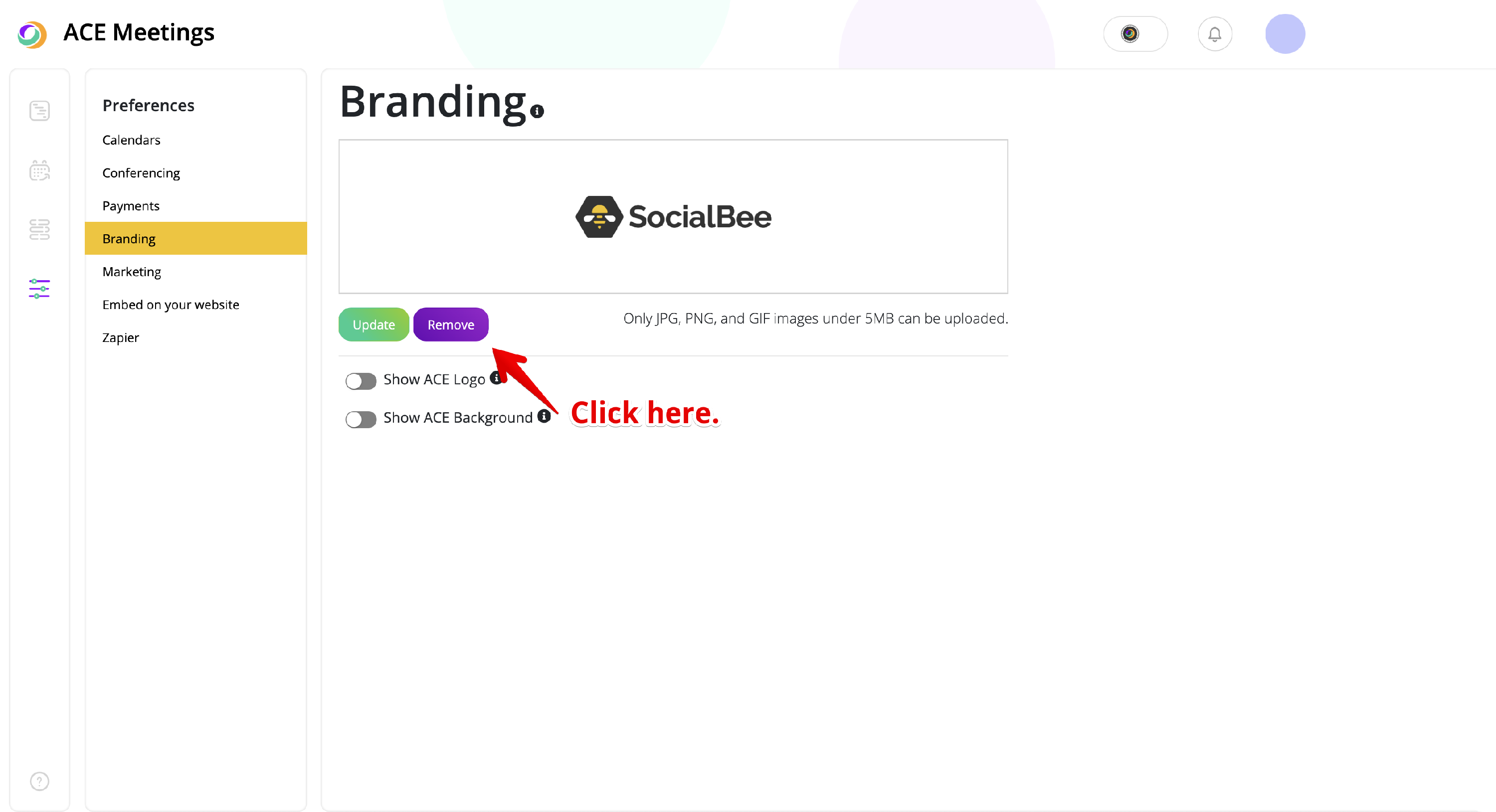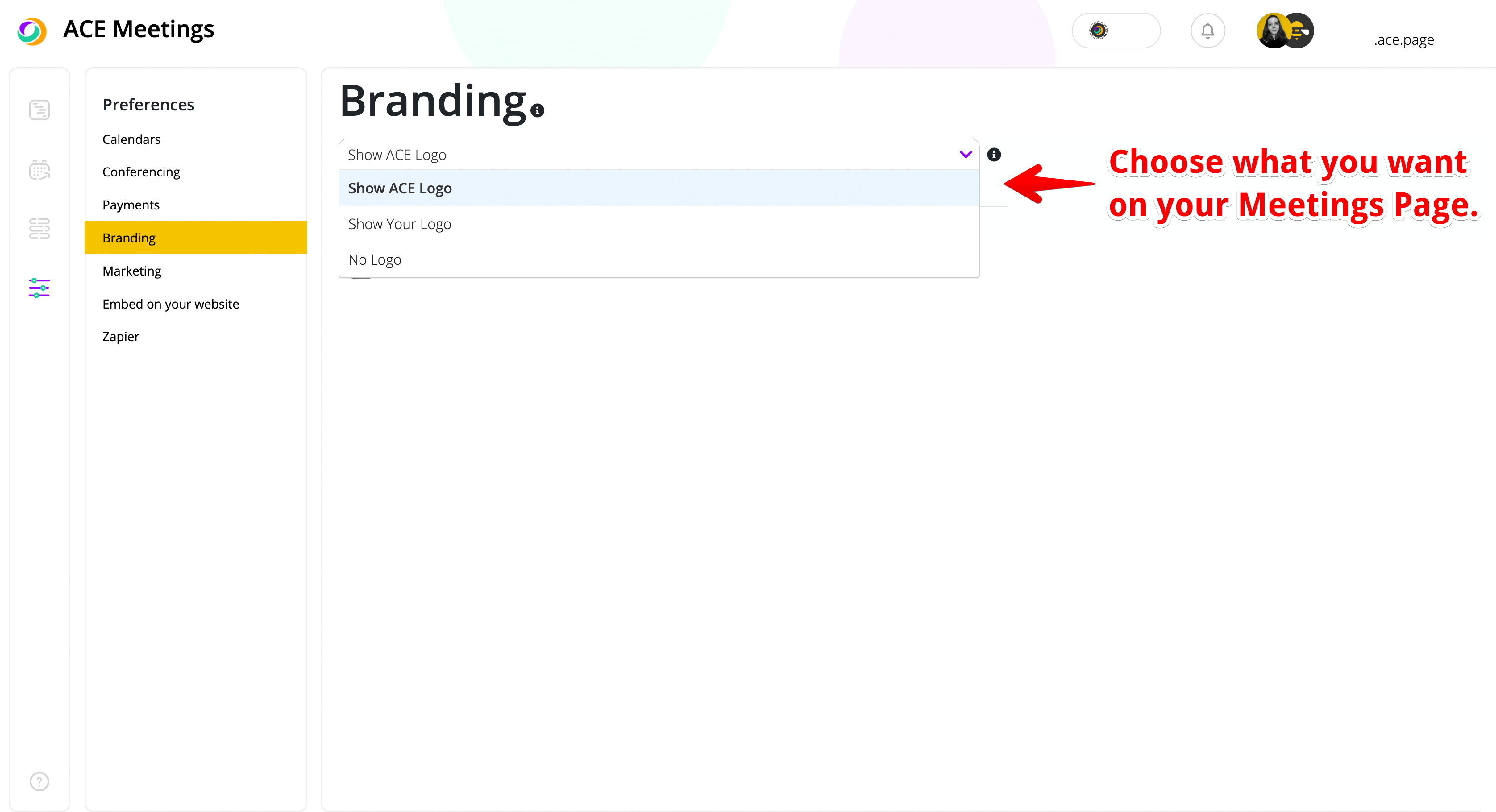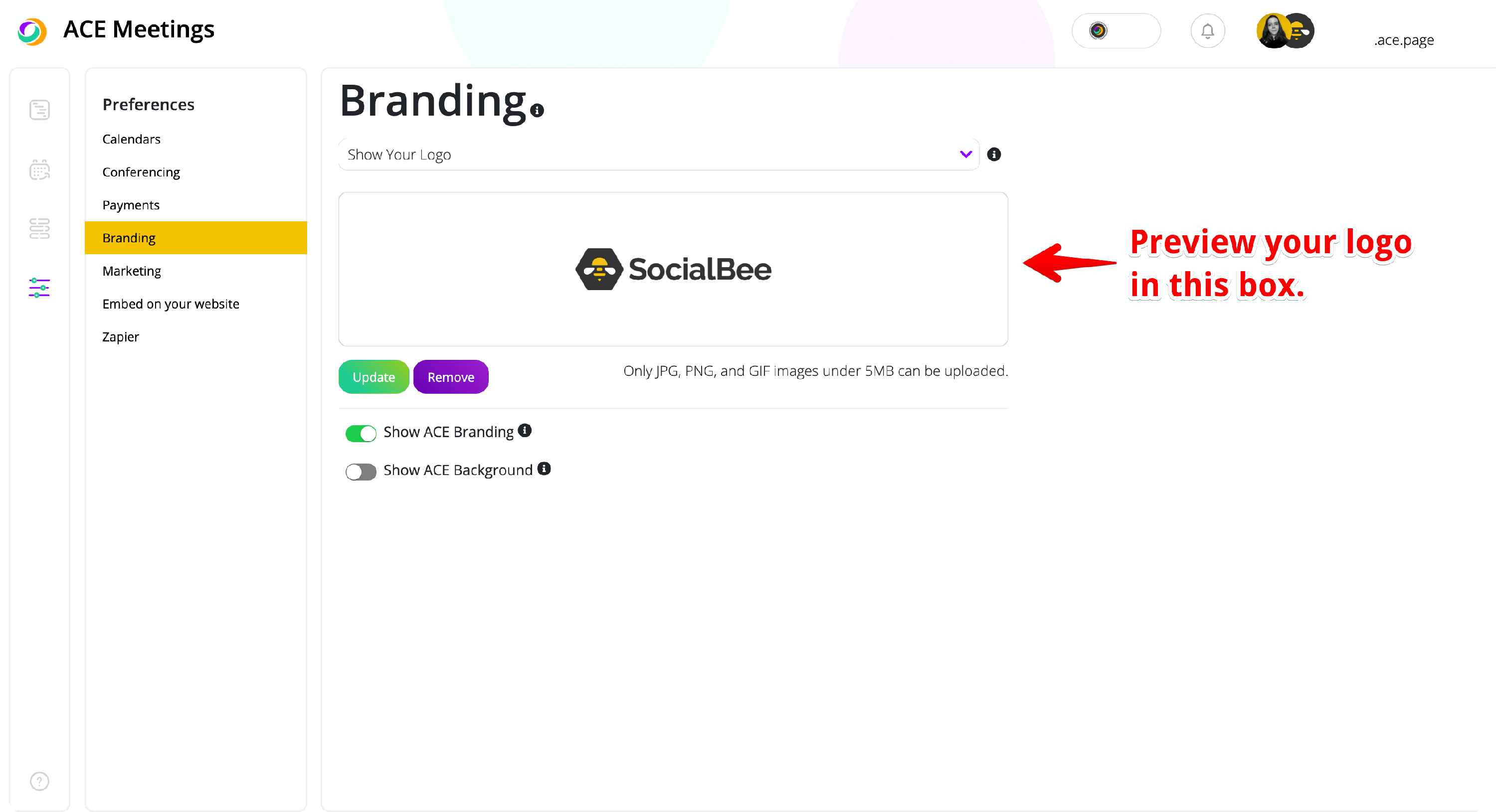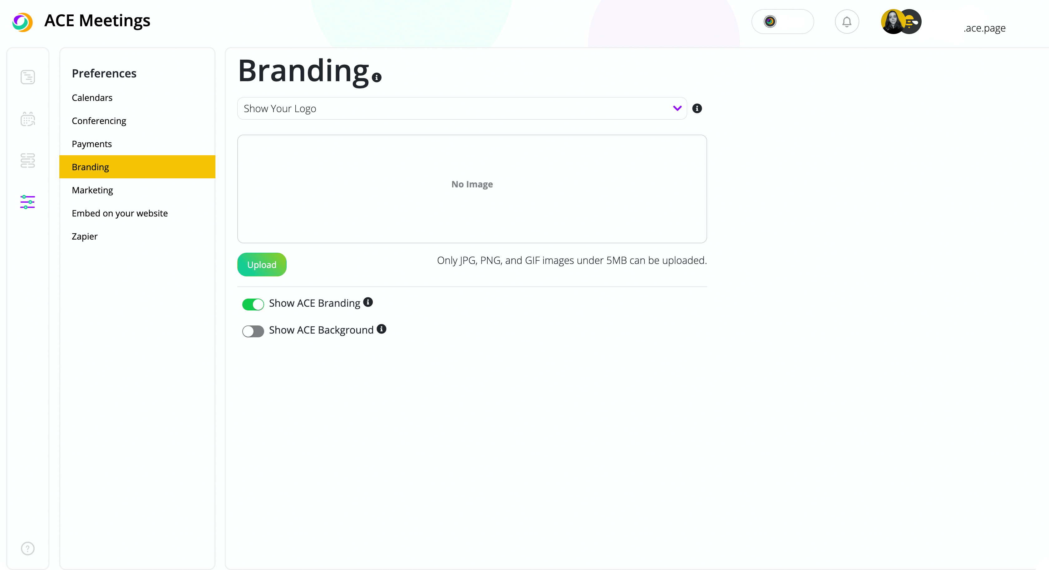 Customizing your calendar is important in order to give your clients a seamless experience with your website or calendar. Adding your company's logo can help them easily identify and, down the line, recognize you. For ACE Meetings, you can upload it into your account's settings and it will apply to all your existing meeting types.