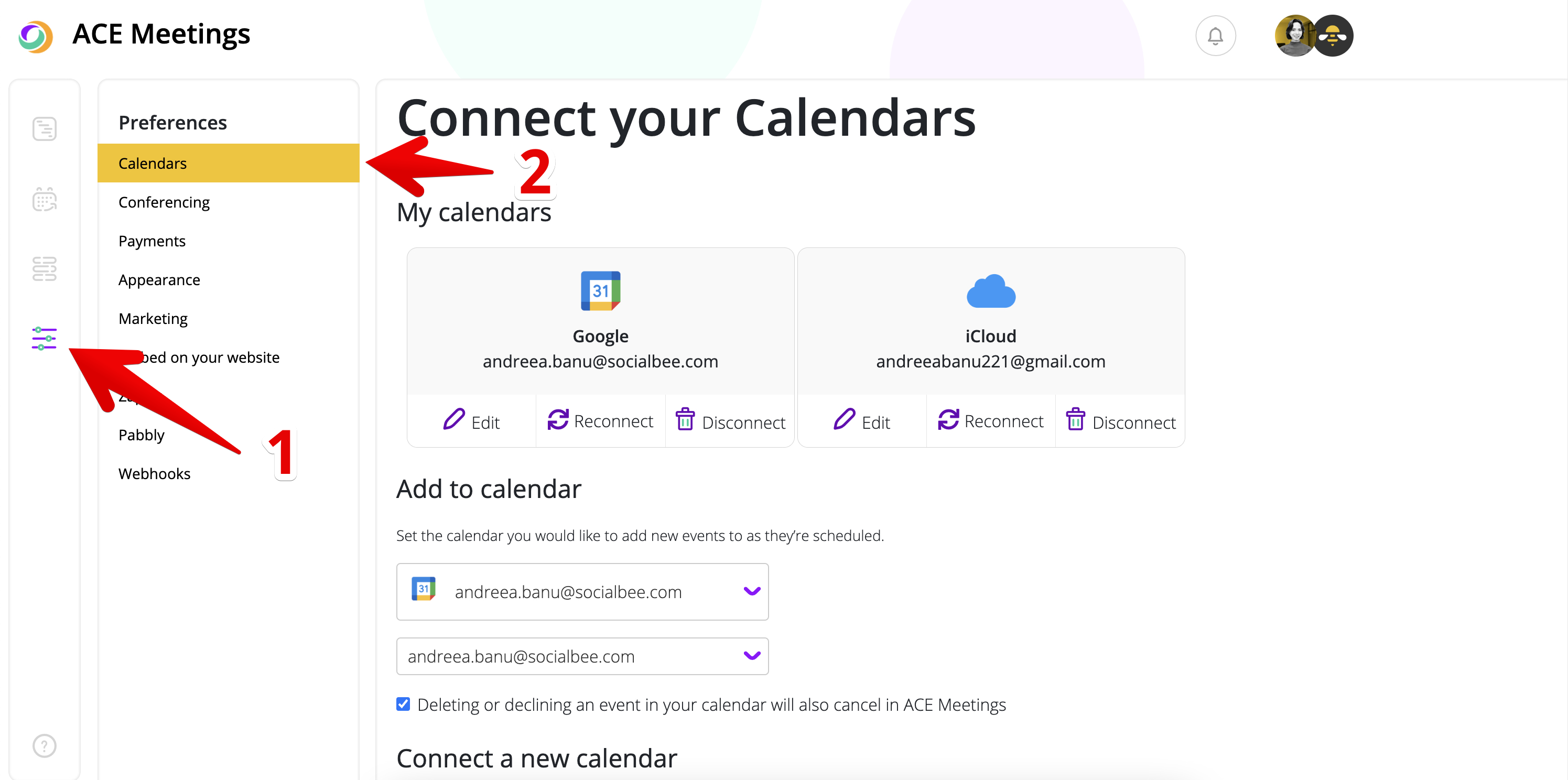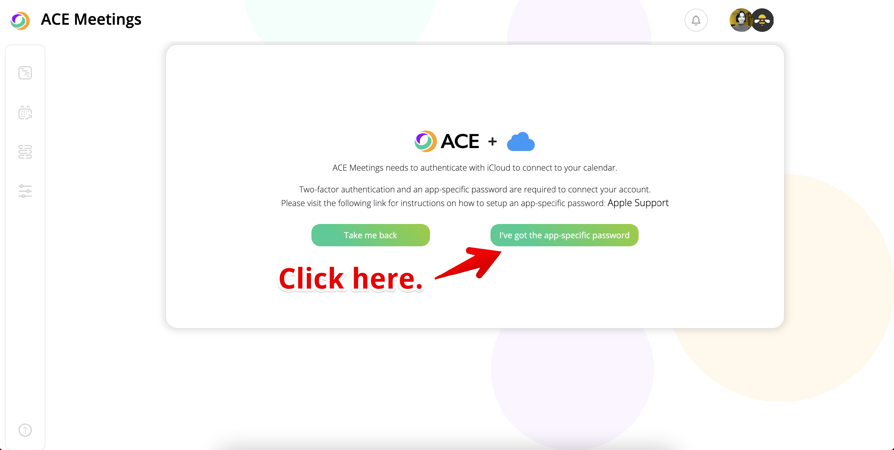 Now you've connected ACE Meetings to your iCloud Calendar. You should be able to see your iCloud Calendar at the top of the "Connect your Calendars" page.