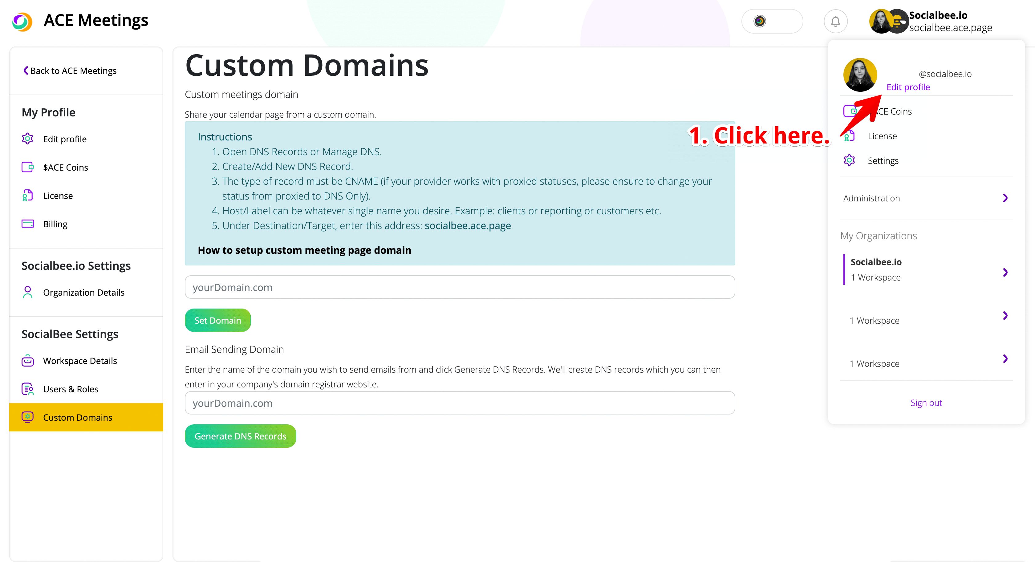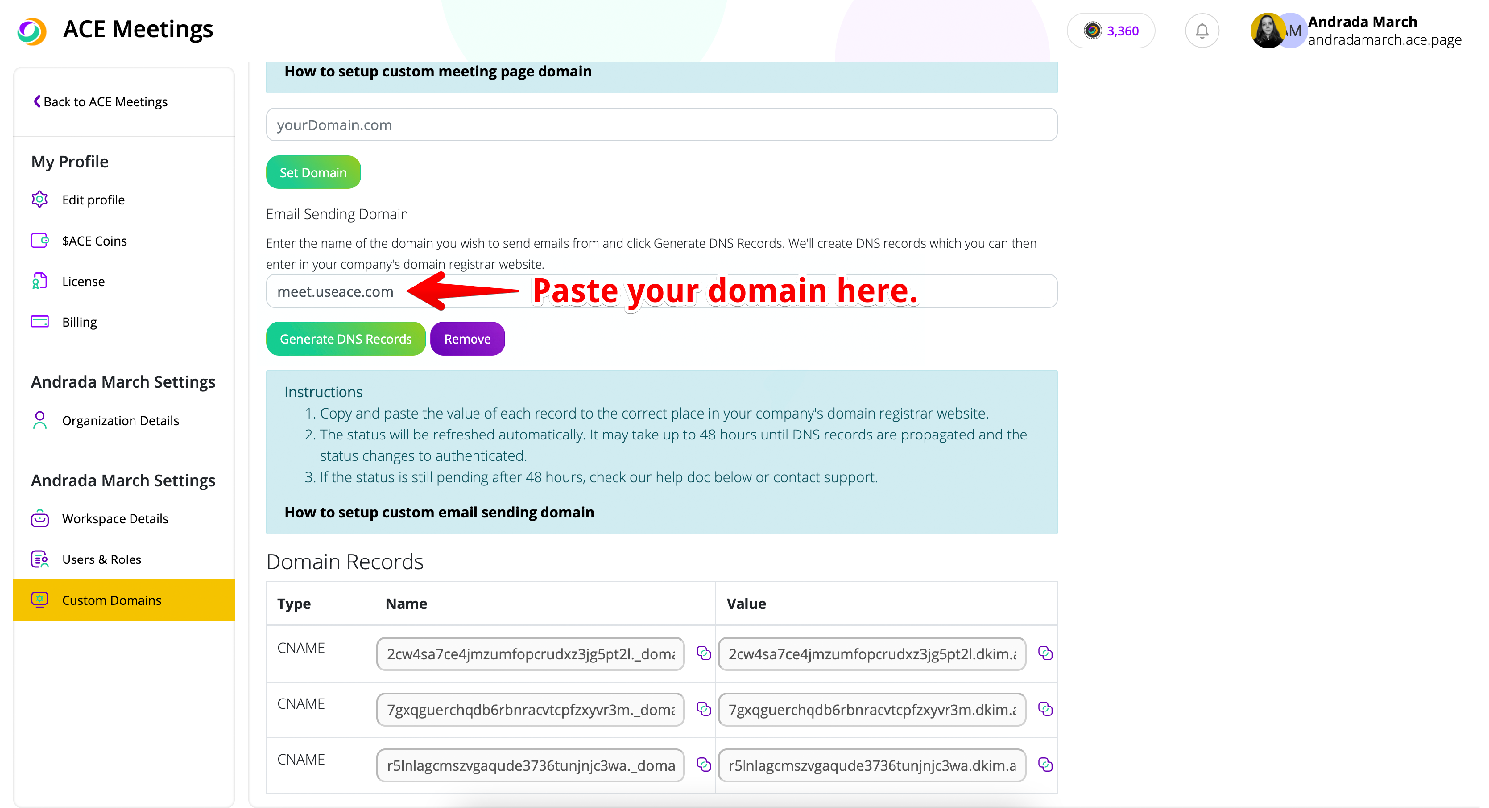 To set up your custom email domain in ACE Meetings, you need to follow 2 simple steps. First, paste your custom email domain in the dedicated field. After that, click "Generate DNS Records". You will see a table generate right under the text box.