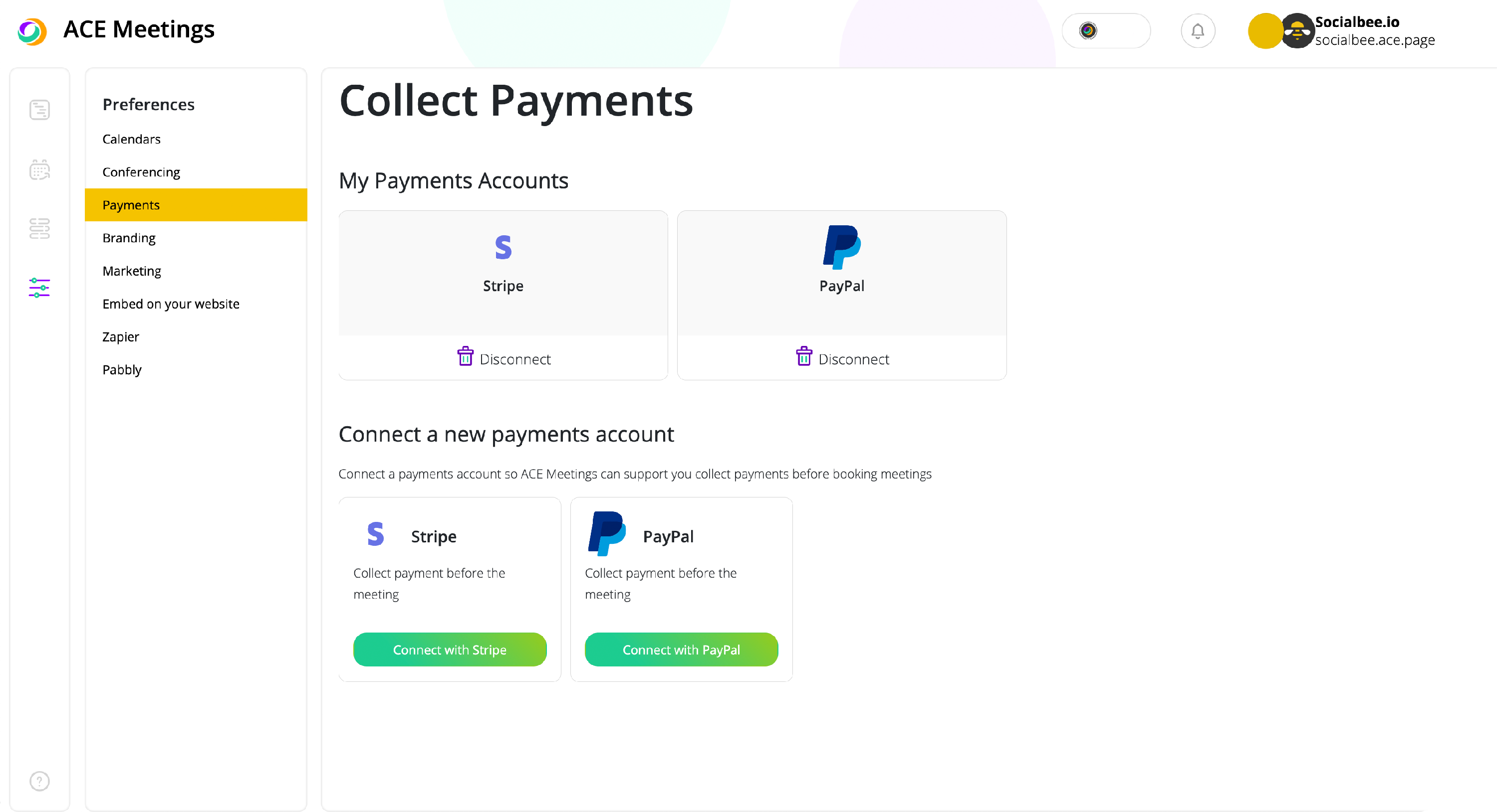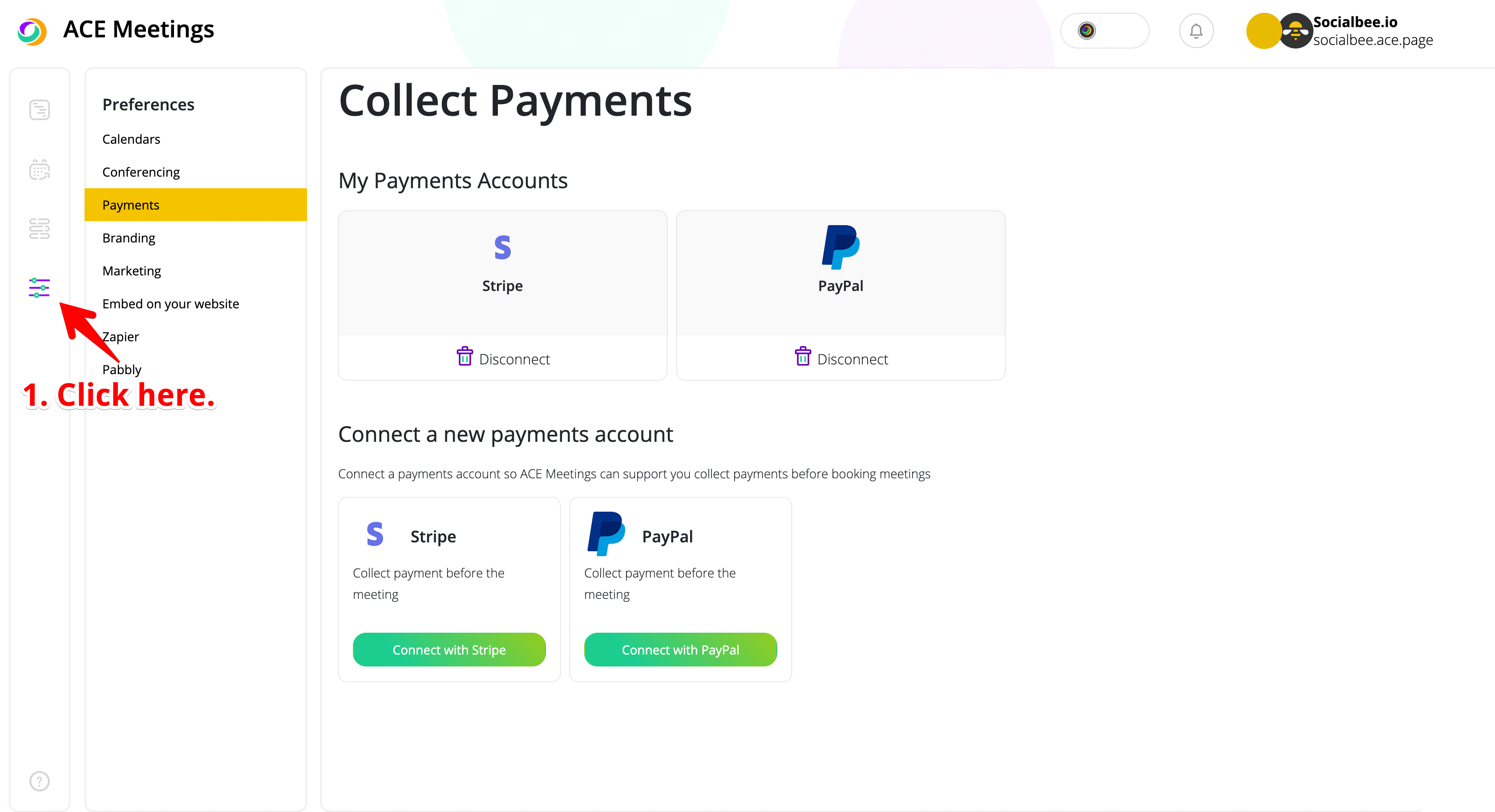 In order to set up your paid-for meetings, you will first need to set up a payment solution. The first step is to go to your Settings, from the left-side menu, then click on the Payments tab.