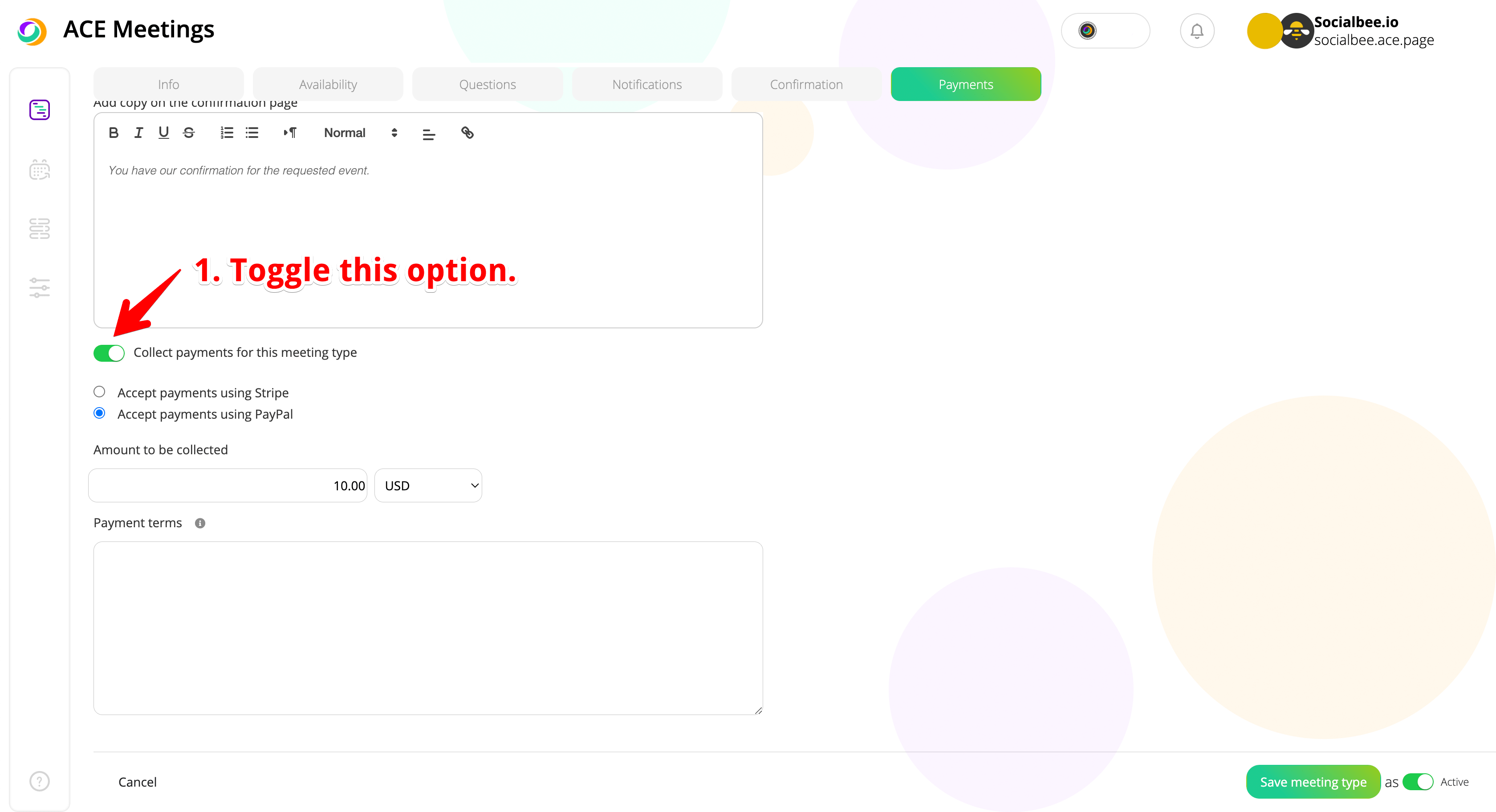 Once you have a PayPal account connected to your ACE Meetings account, you can edit – or create – a new meeting type asking for a payment. In the Meeting Type menu, scroll all the way to the bottom, where you need to follow 3 quick steps: