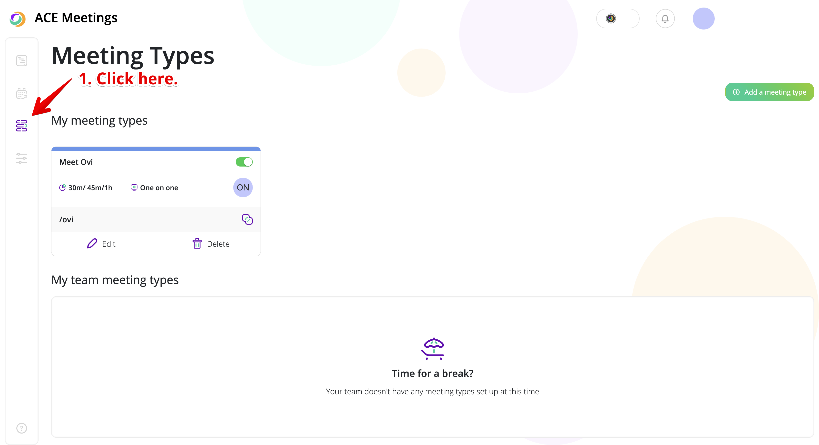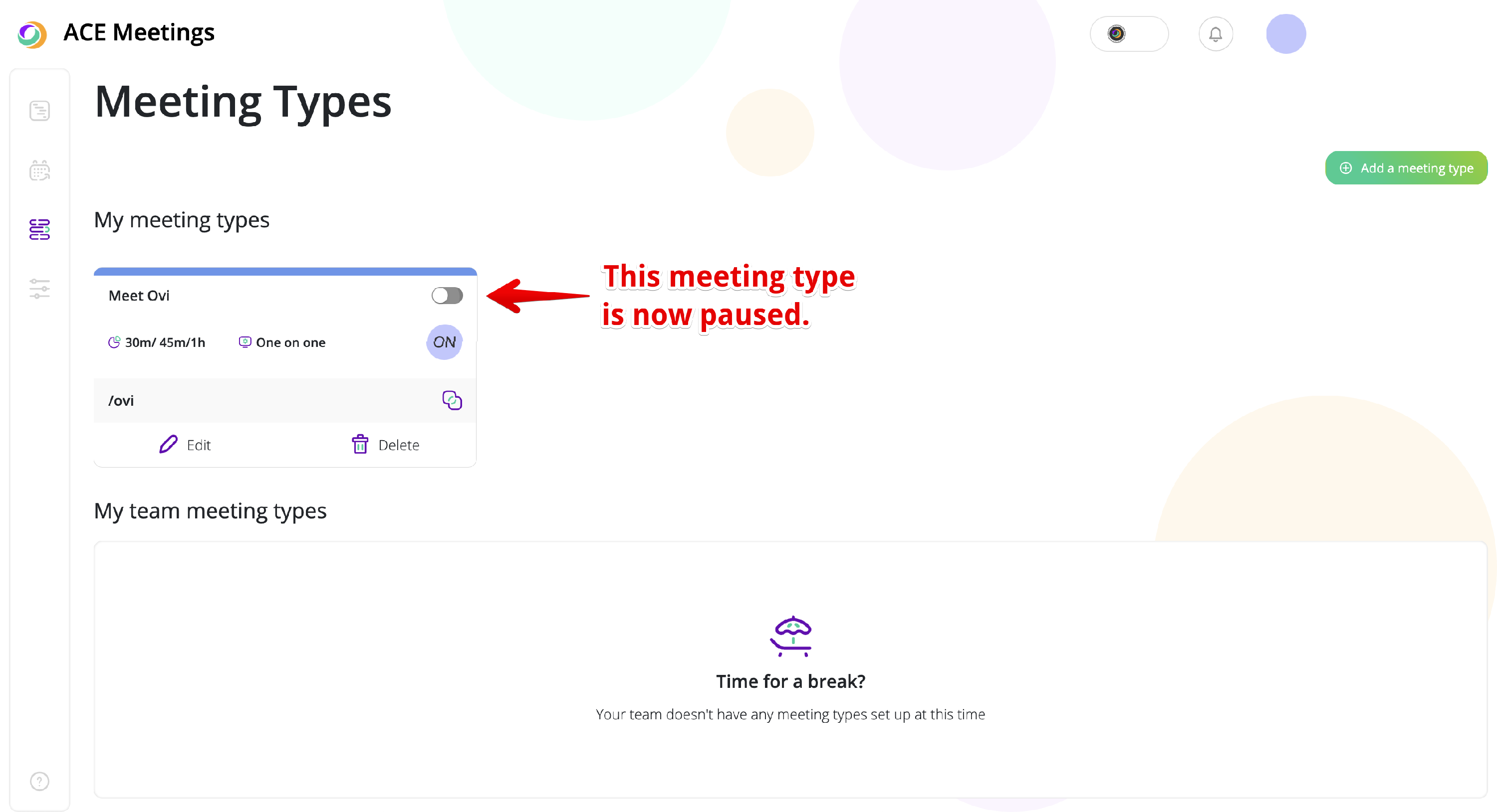 In order to pause a meeting type, you first have to open the respective menu. To do this, on the right-side menu, click on the designated button. Once you’ve done that, you will be able to see all your meeting types: active and paused. On the top right corner, you will see a toggle button that can keep your meeting in either state.