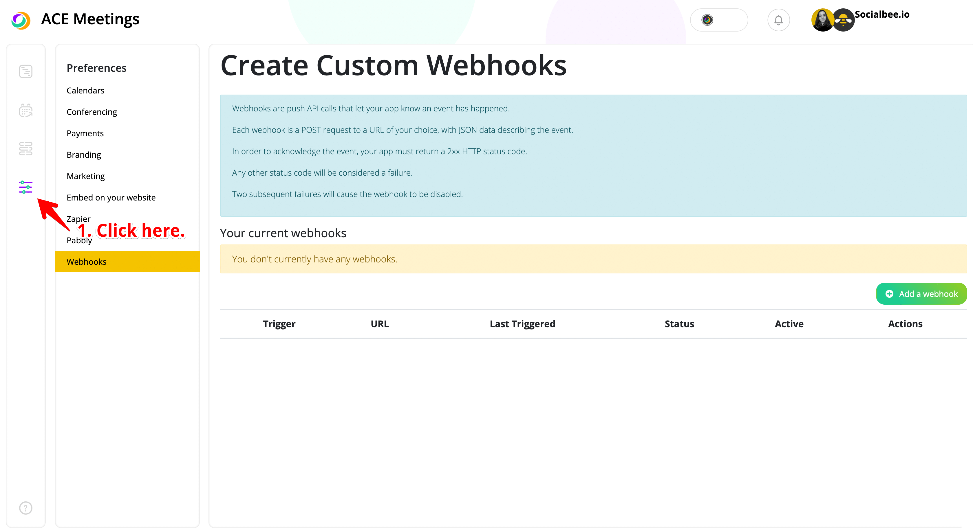 Customize your automation to any degree with our custom webhooks. You can use them to track all the booked, rescheduled, or canceled calls. Once you have your webhook set up and hosted, all you have to do is follow a few steps in ACE Meetings.