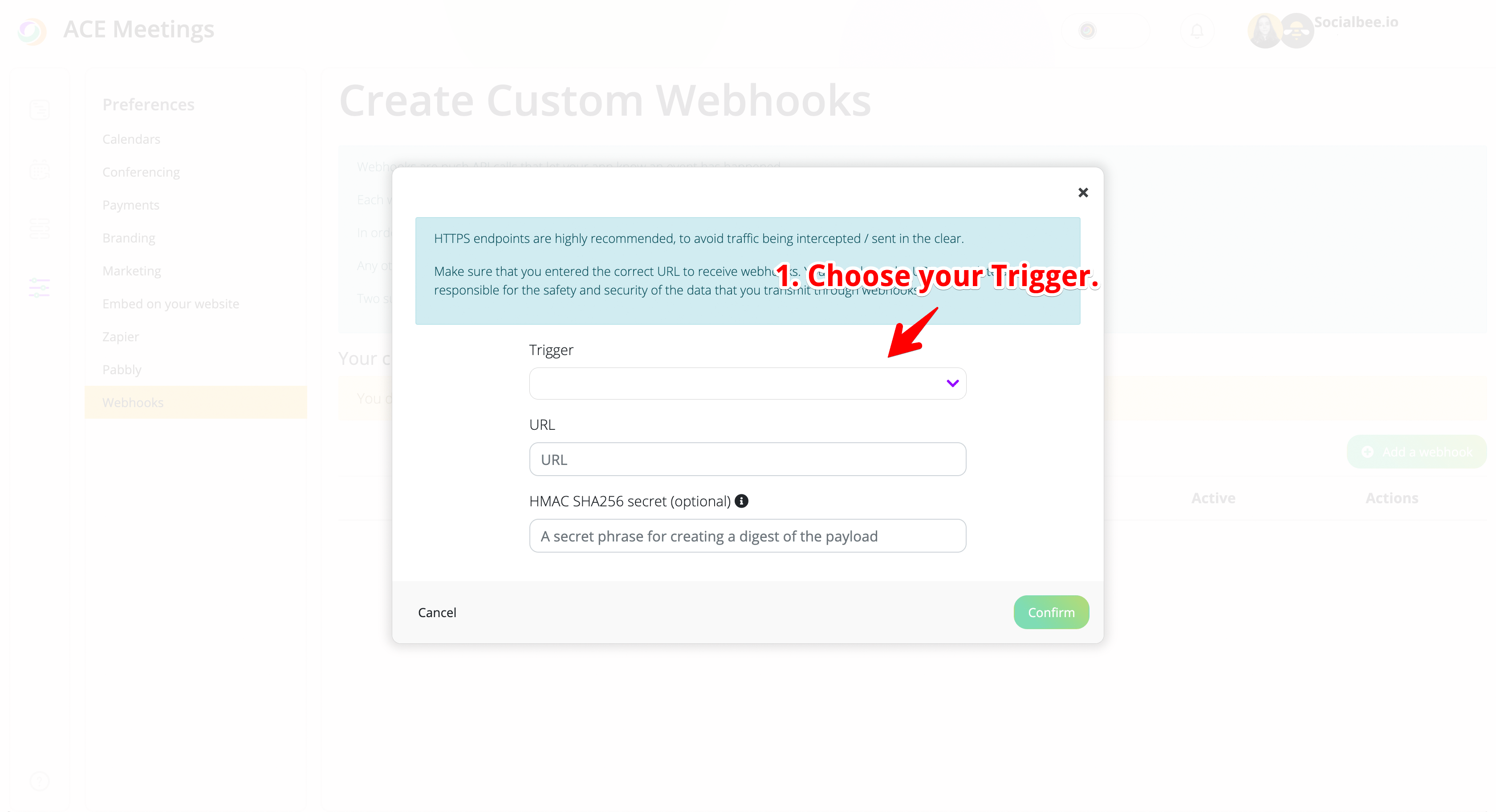 - Choose your trigger, between creating (book), rescheduling, or canceling a meeting. HTTPS endpoints are highly recommended, to avoid traffic being intercepted/sent in the clear. Make sure that you entered the correct URL to receive webhooks. You must keep the URL up-to-date and are responsible for the safety and security of the data that you transmit through webhooks.