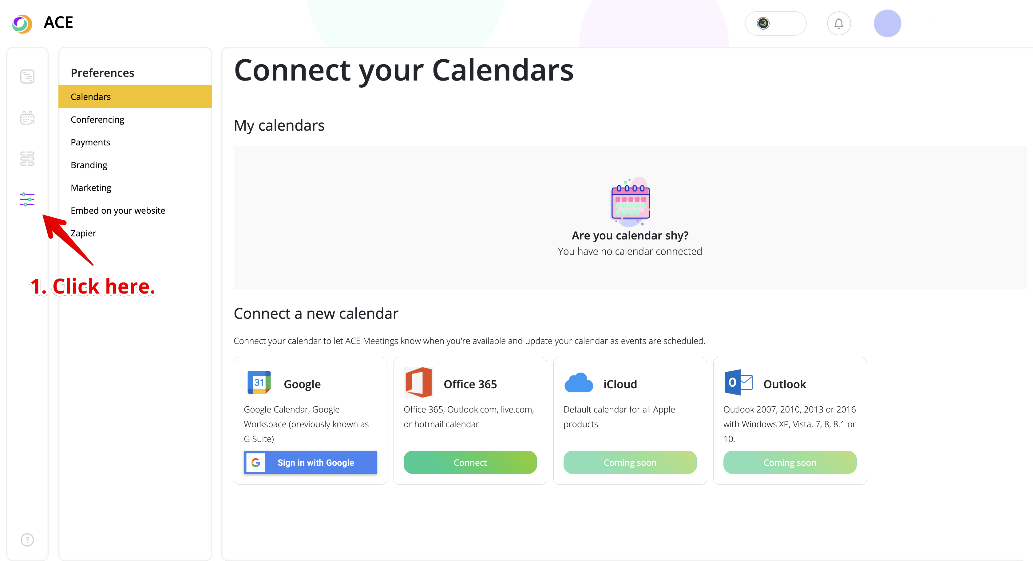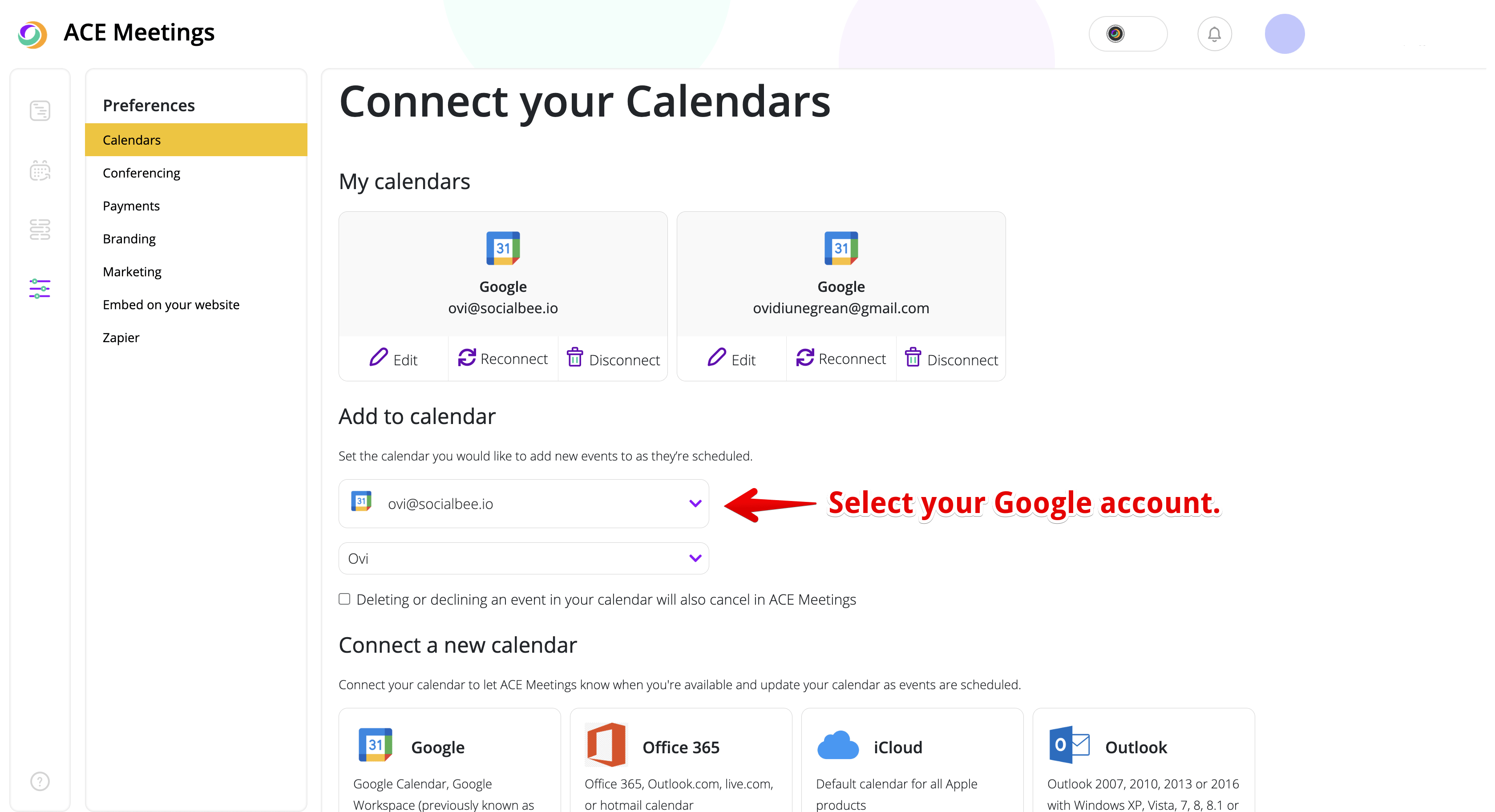 After you have connected the Google Calendar to ACE Meetings, you will be prompted to select which calendar we should check for availability. Make sure to select your main calendar in this section so the meetings are set accordingly.
