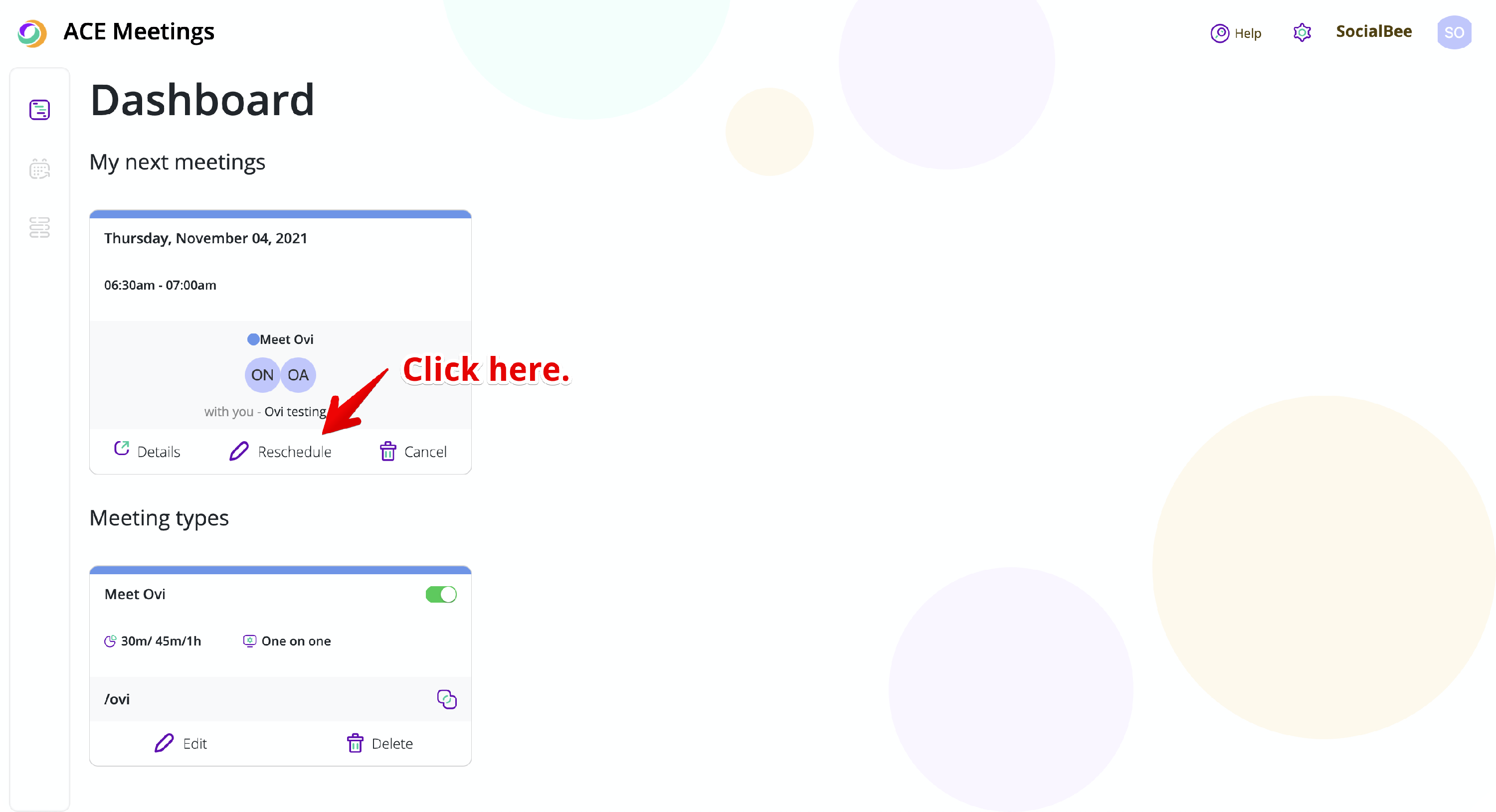 As soon as you have a meeting booked, you can head to your ACE Meetings dashboard. On the upper half of the screen, you will see your upcoming meetings. If you see a meeting that should be canceled, you can click on the designated button.