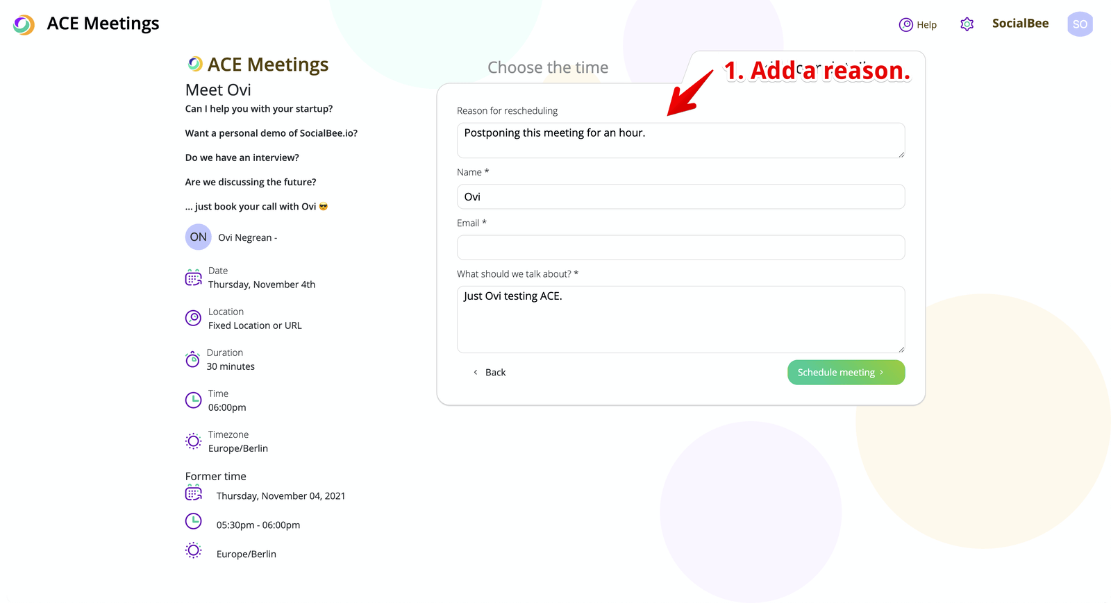 The next step is to fill in the reschedule reasoning as well as review some details about the client: their name, email address, and what they want to discuss in this meeting. Once you’re done, just click “Schedule” and you’re done! Your client will be notified about this via email.
