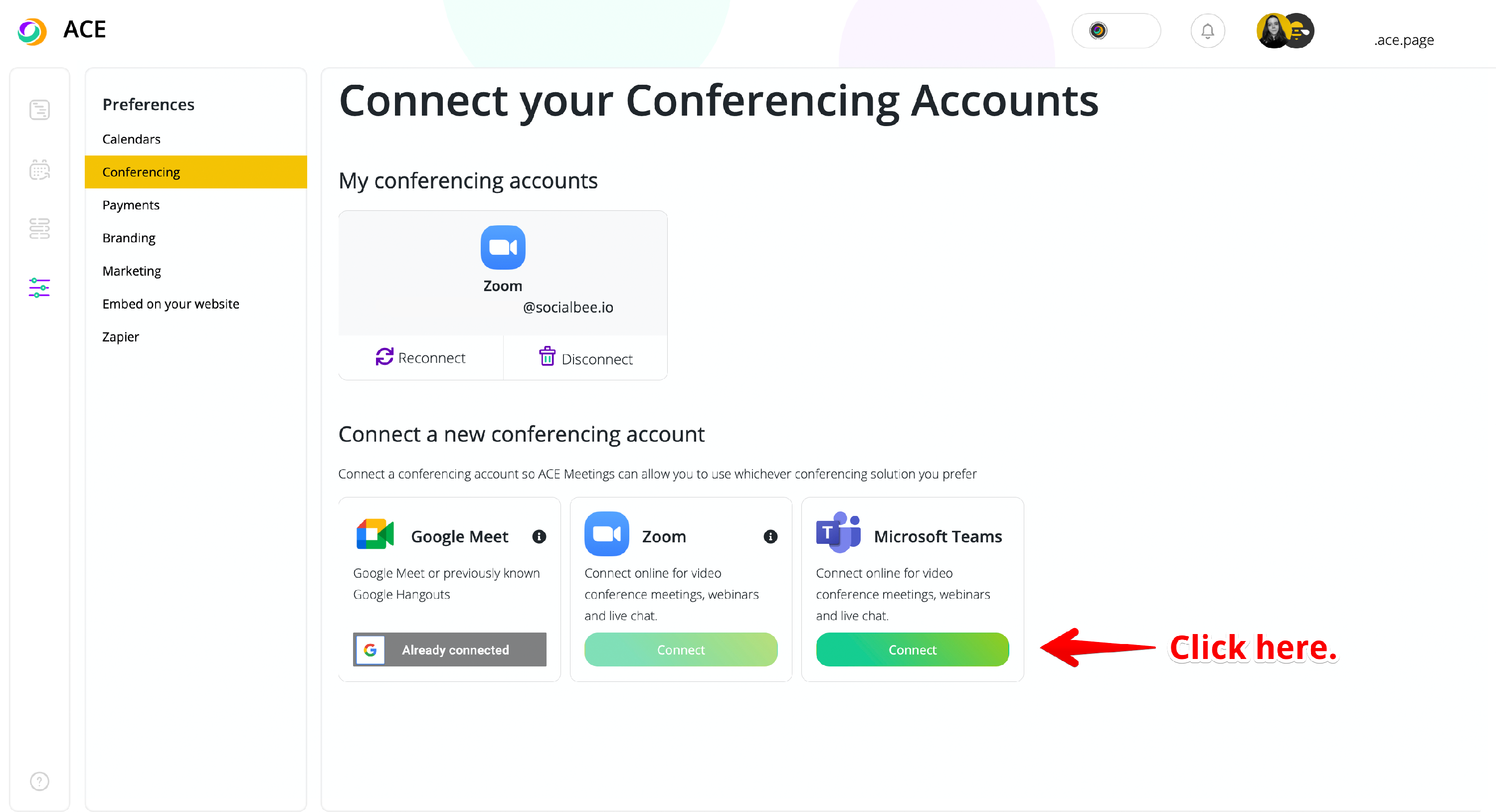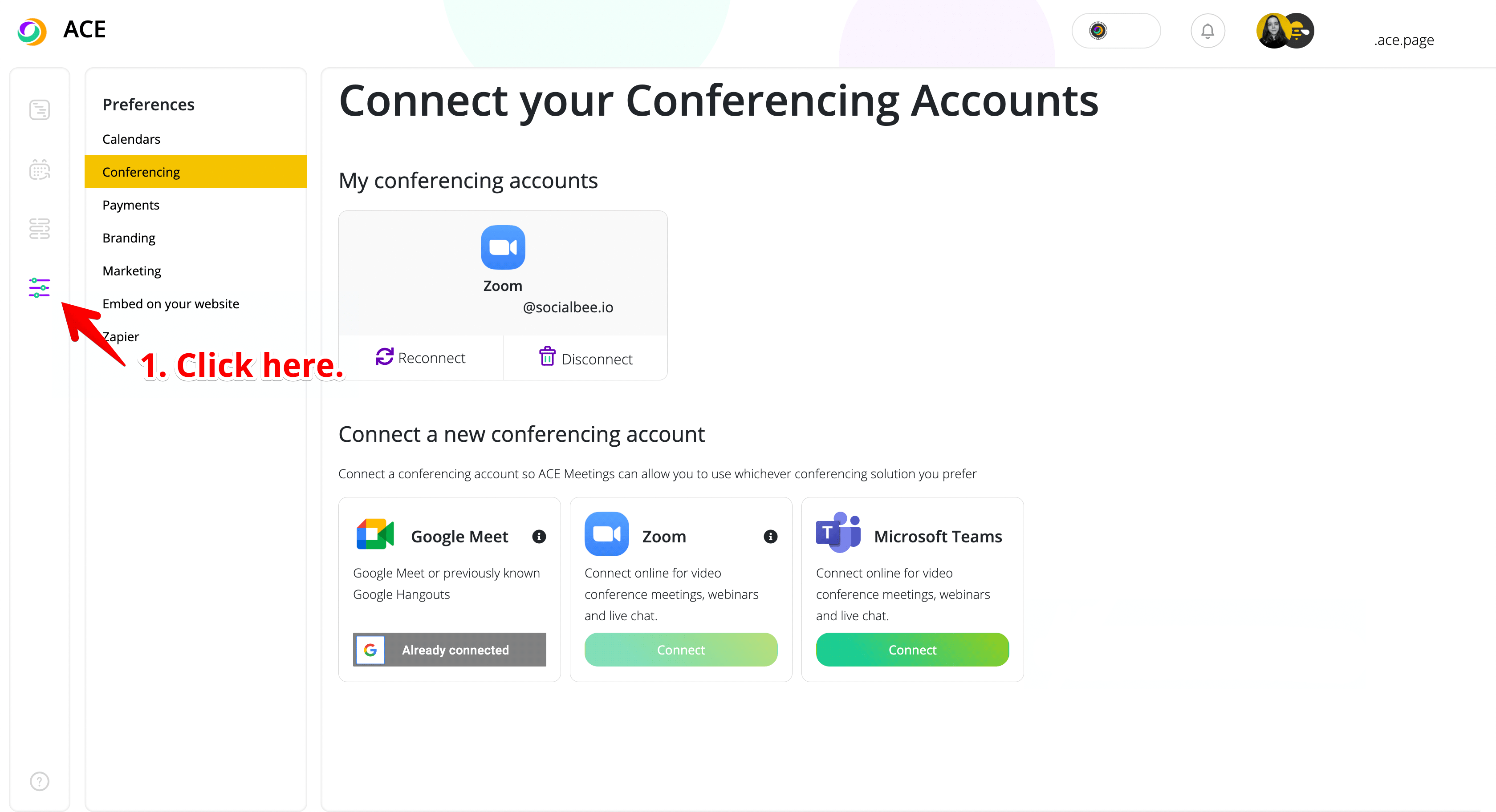 To connect your account, you must first head to your Settings, from the left-side menu, then go to Conferencing.