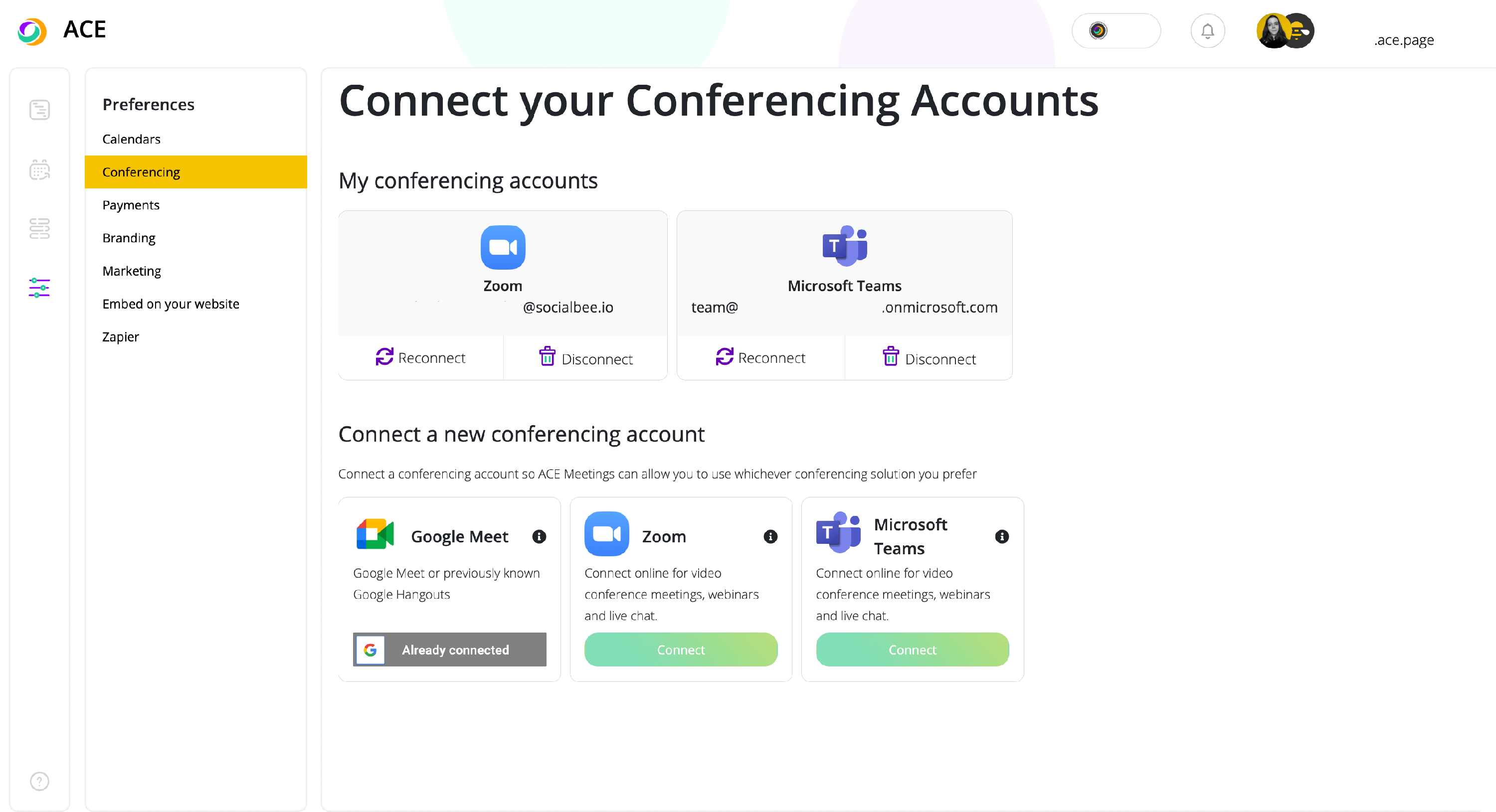 Once you did this, you will be prompted to log into your account. Follow the steps in this flow and authorize ACE Meetings in your account. Once you did this, you will return to the ACE Meetings menu and your account will appear between your conferencing accounts.