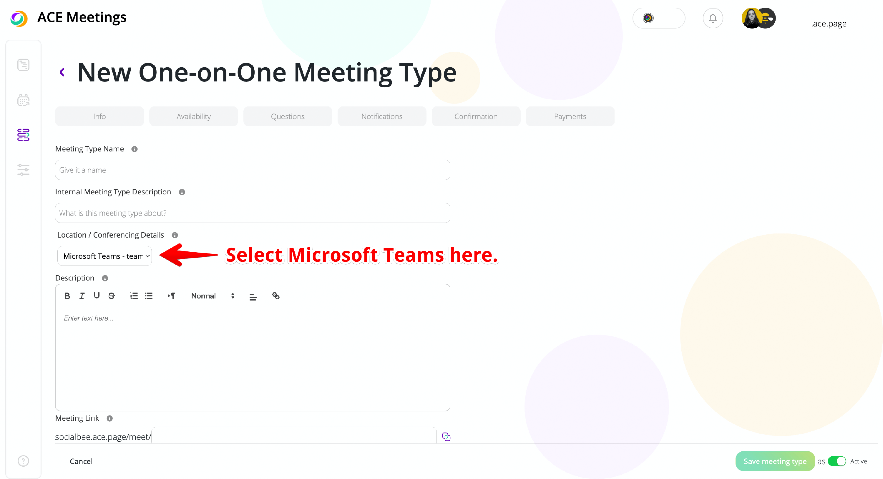 Whether you are creating a new meeting type or updating an older one, you can select your Microsoft Teams account in the Location / Conferencing Details.