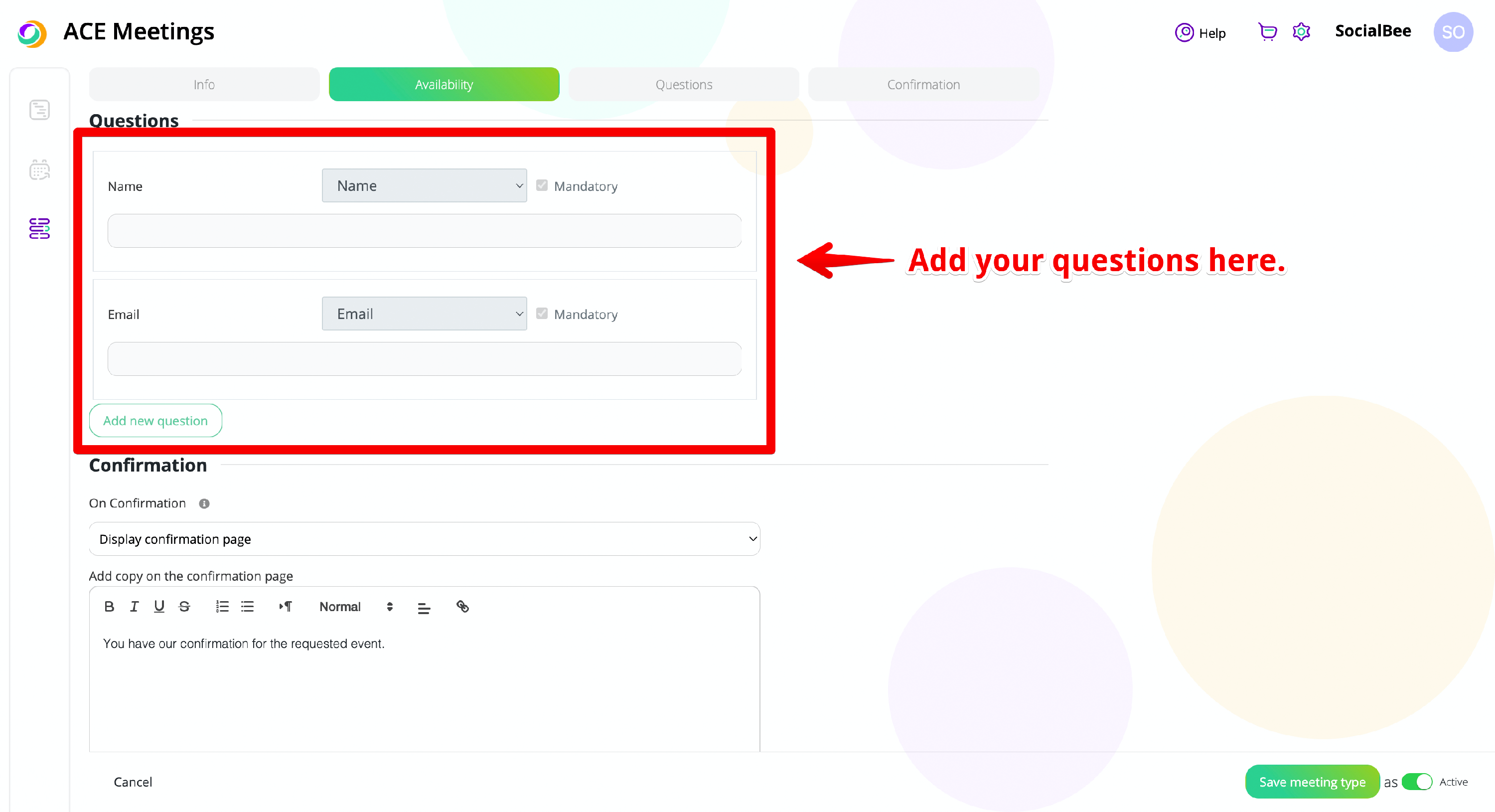 In the third section of your meeting type, you will have to choose the questions you want to add to your Meeting Type. Two questions are set as mandatory and cannot be removed by any user: name and email. After this, you will be able to add any of the following question type: