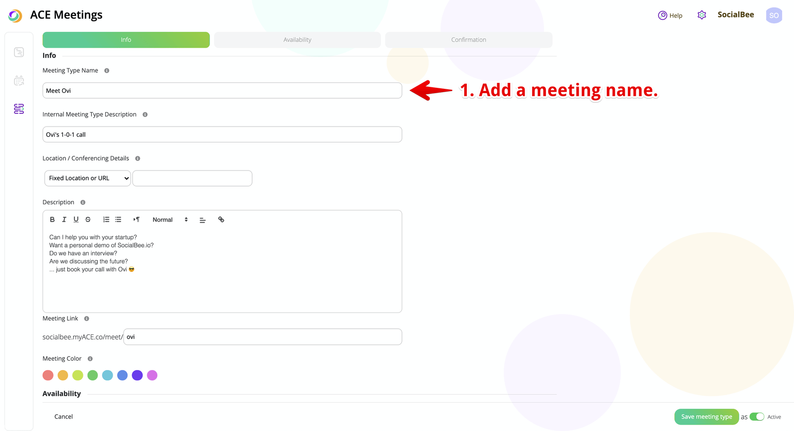 In the first section of your meeting type, you will have to go through the basic information that everyone should know about your meeting. Here is what you will have to do: