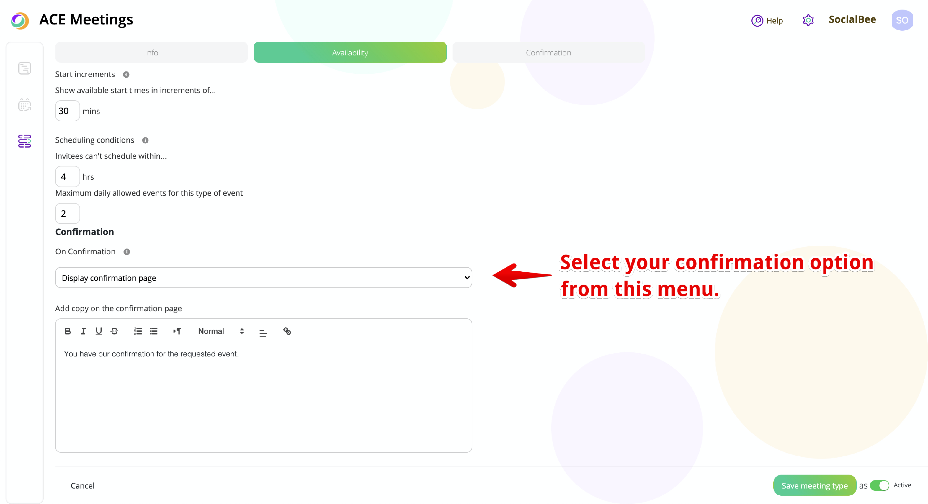 In the fourth, and final, section of your meeting type, you will have to choose the confirmation screen of your meeting. You can either have clients stay on the same page, and offer them more information, or redirect them to a website page of your choosing.