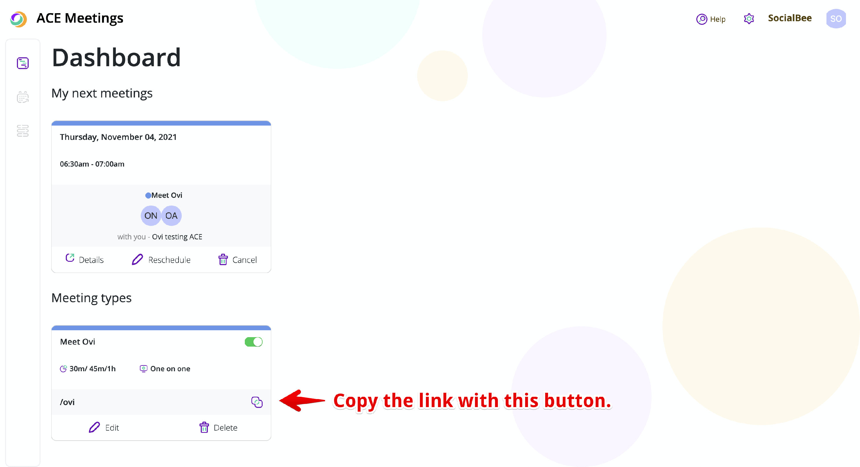 In your Meeting Types menu, find your meeting in the list, and copy the link using the designated button and, from there, you’re ready to share it in an email, message, or anywhere you might need!