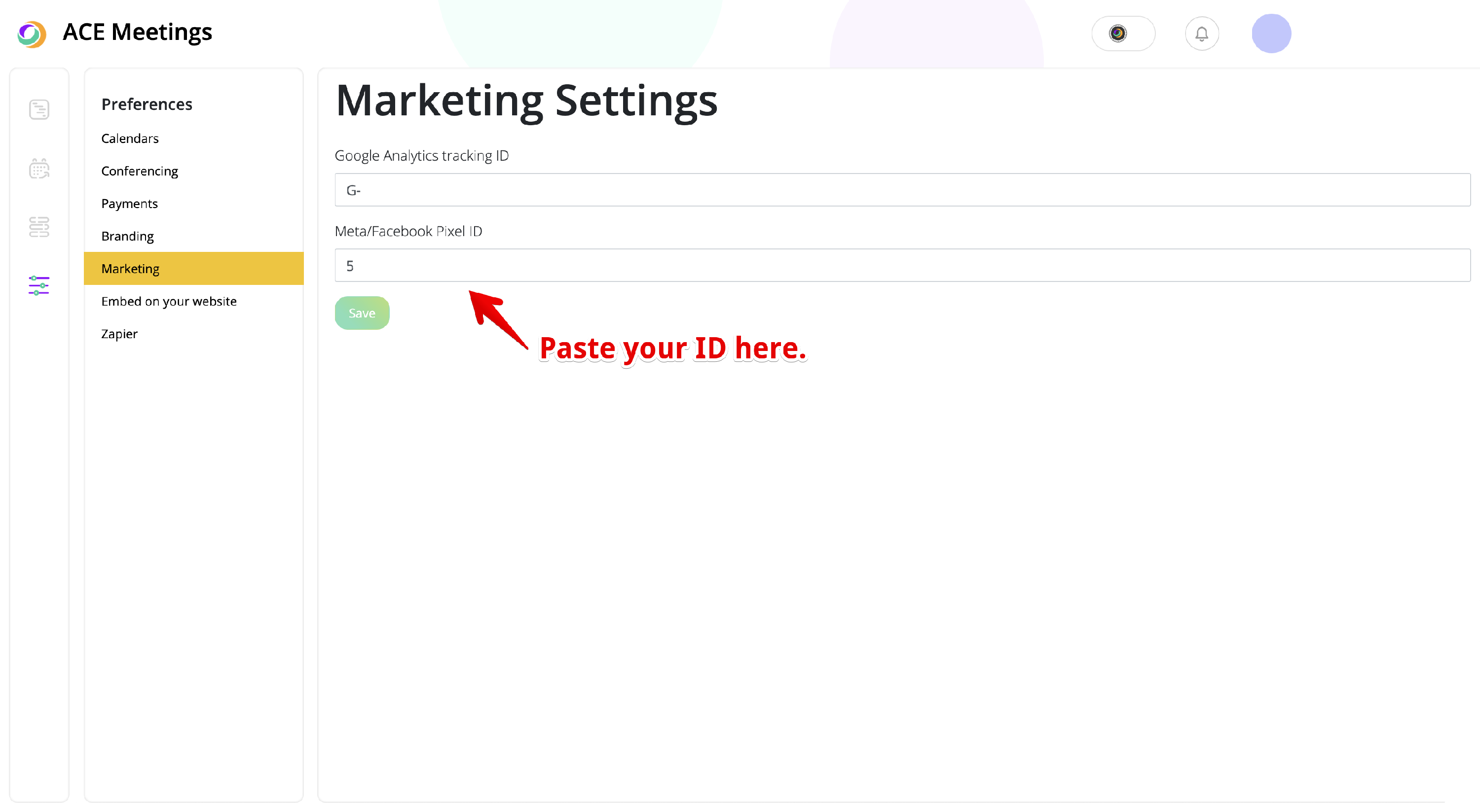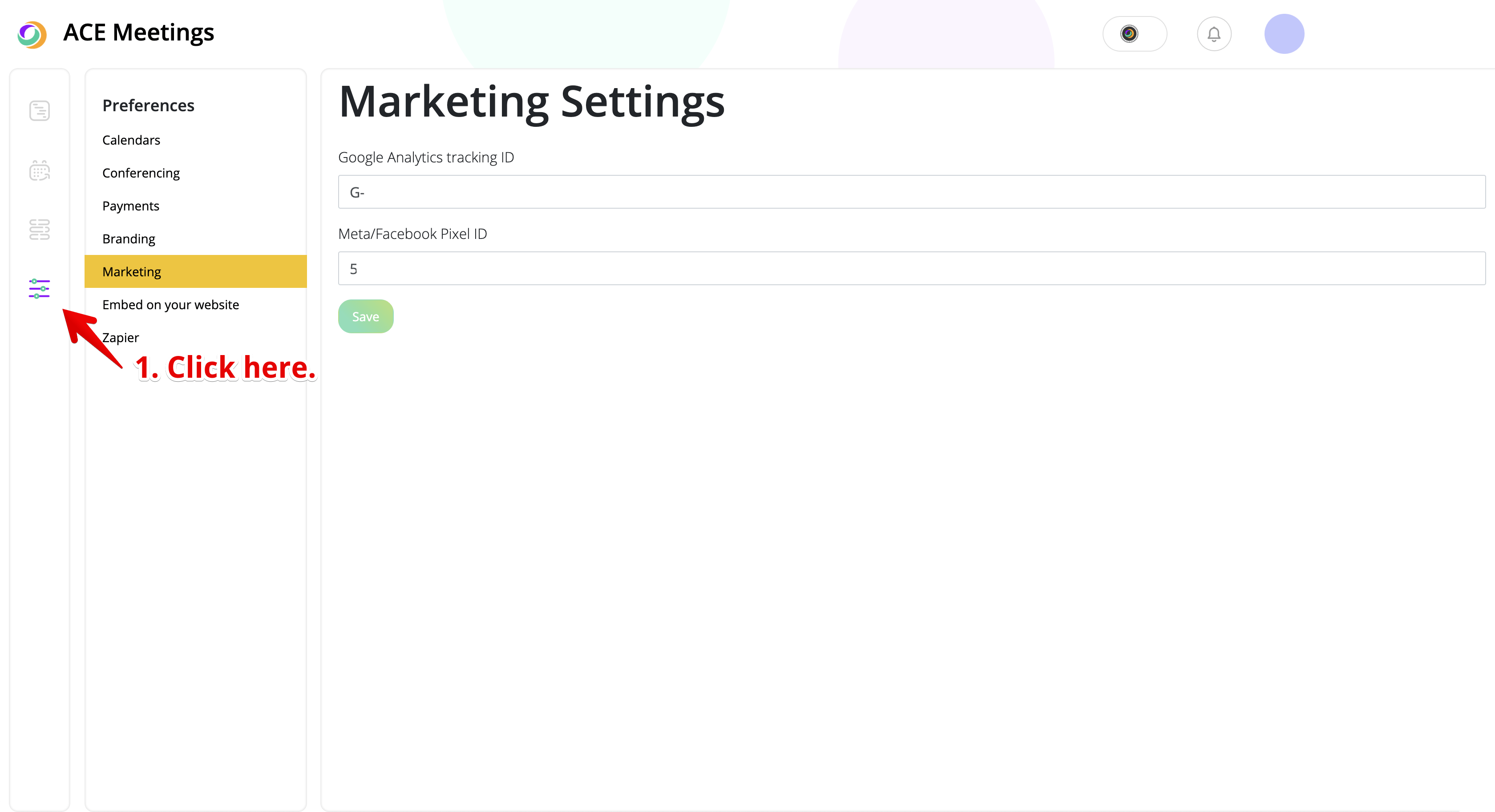 If you want to use Google Analytics IDs or a Meta Pixel for your ACE Meetings, all you have to do is add it to your account. Once you have your IDs on hand, the first thing you will want to do is head to your Marketing Settings.