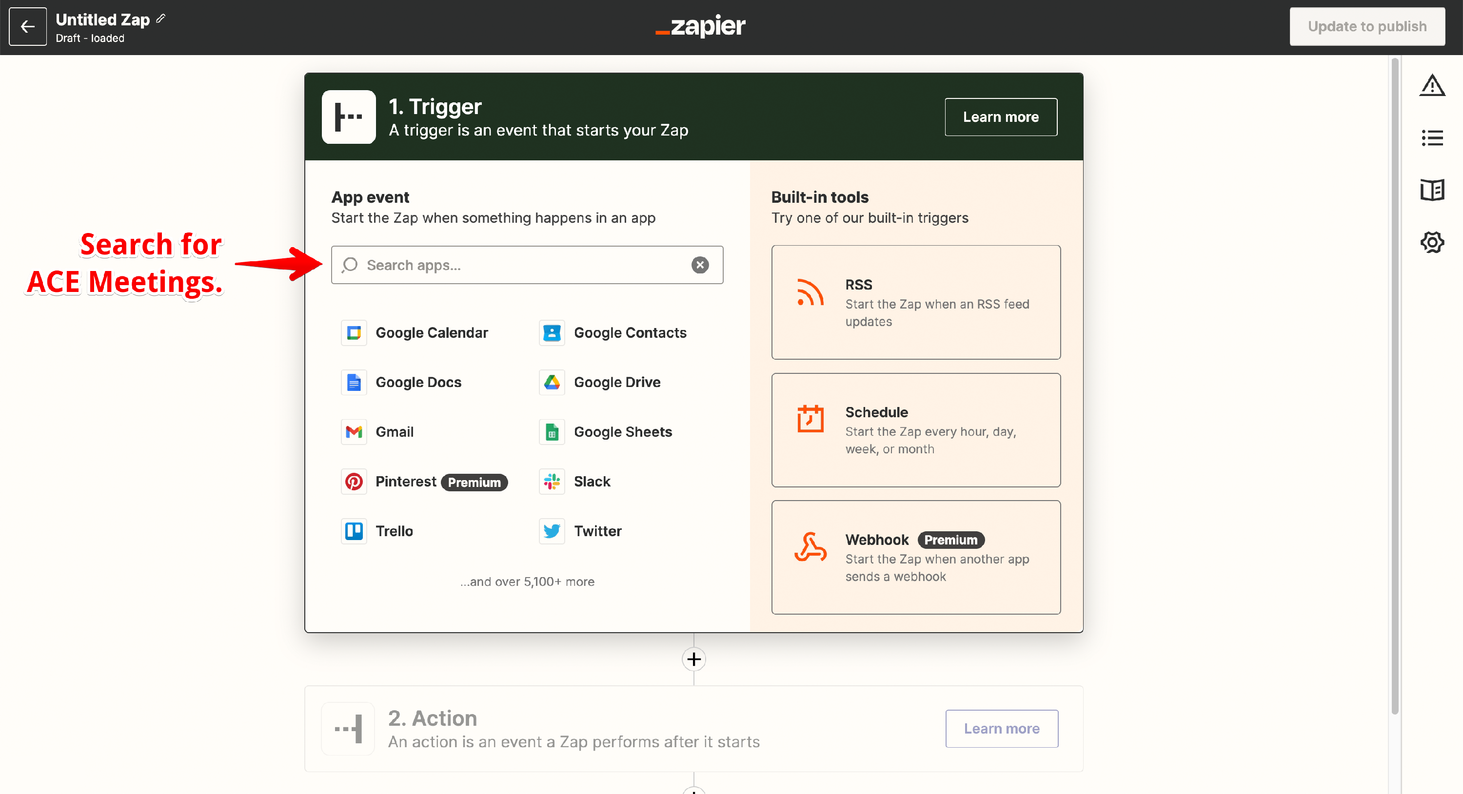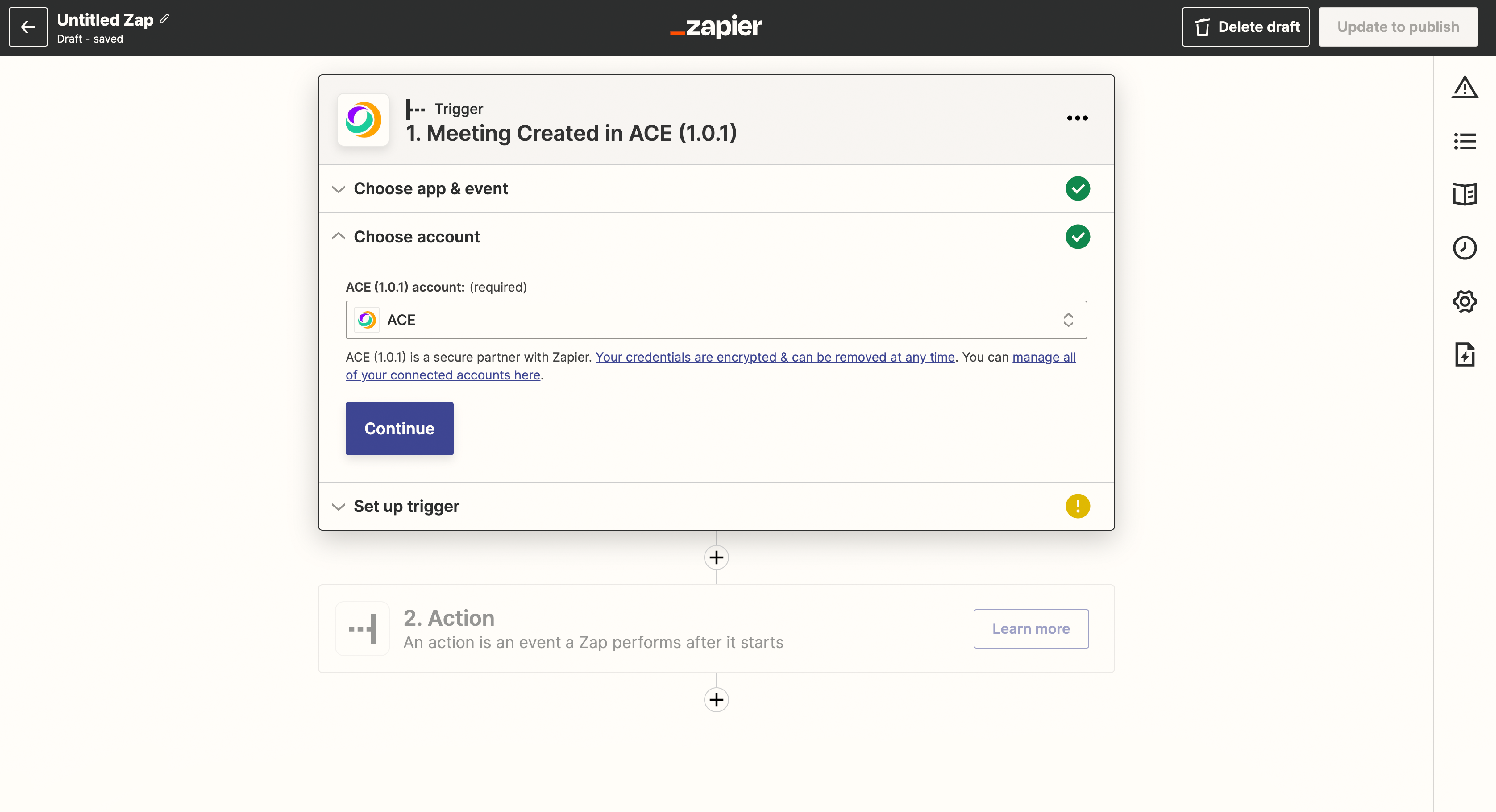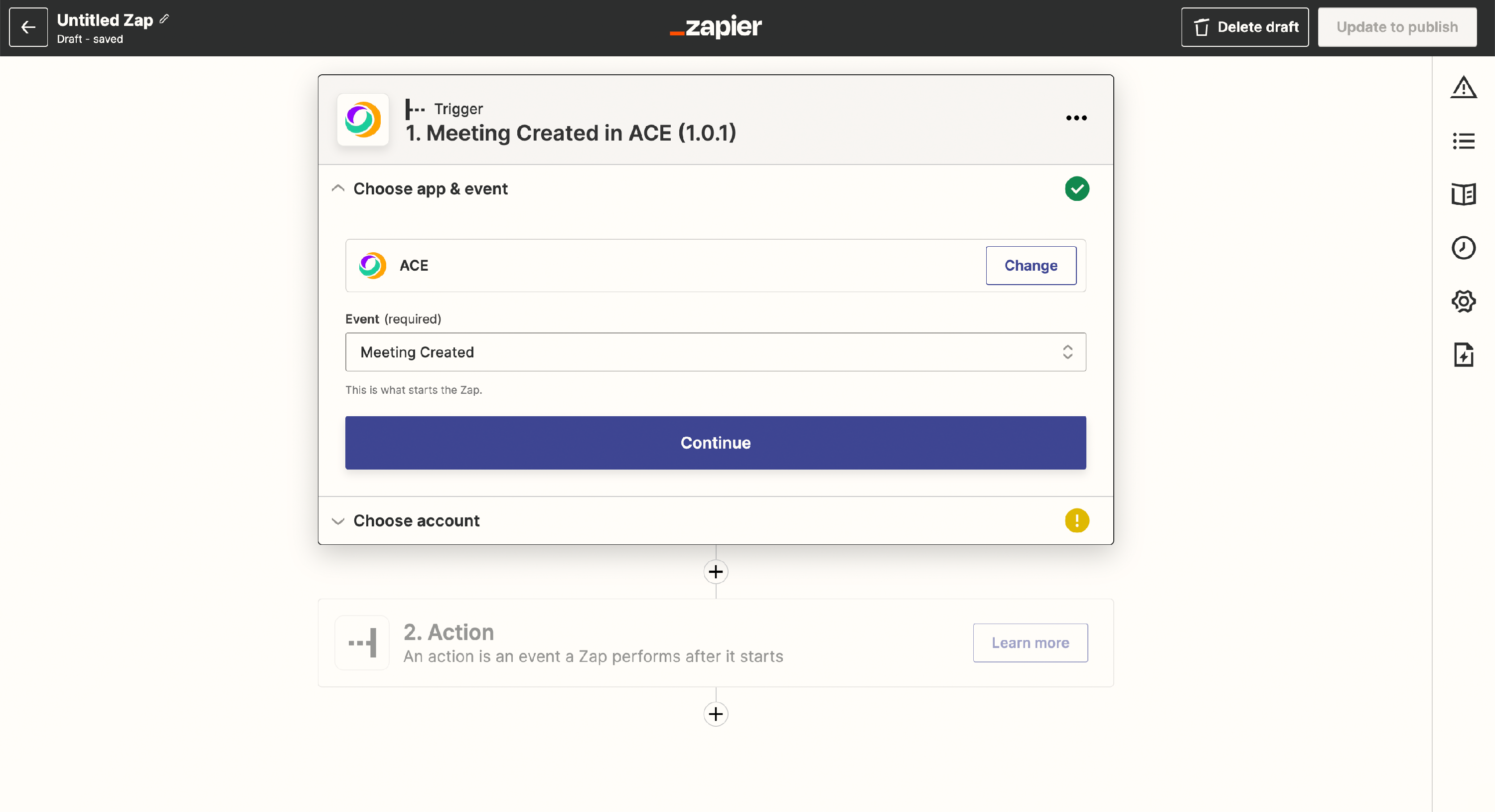 The first thing you have to know when creating a new Zap connected to ACE Meetings is that it acts like a trigger to the Zap. This means that an event needs to happen within ACE Meetings before your action will follow.
