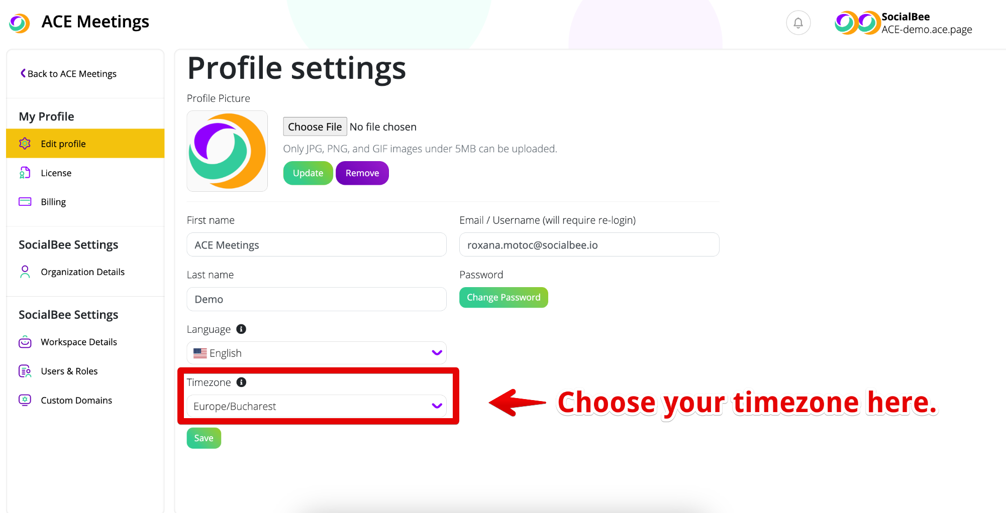 Customize your ACE Meetings' account timezone from your Profile's Settings found here.