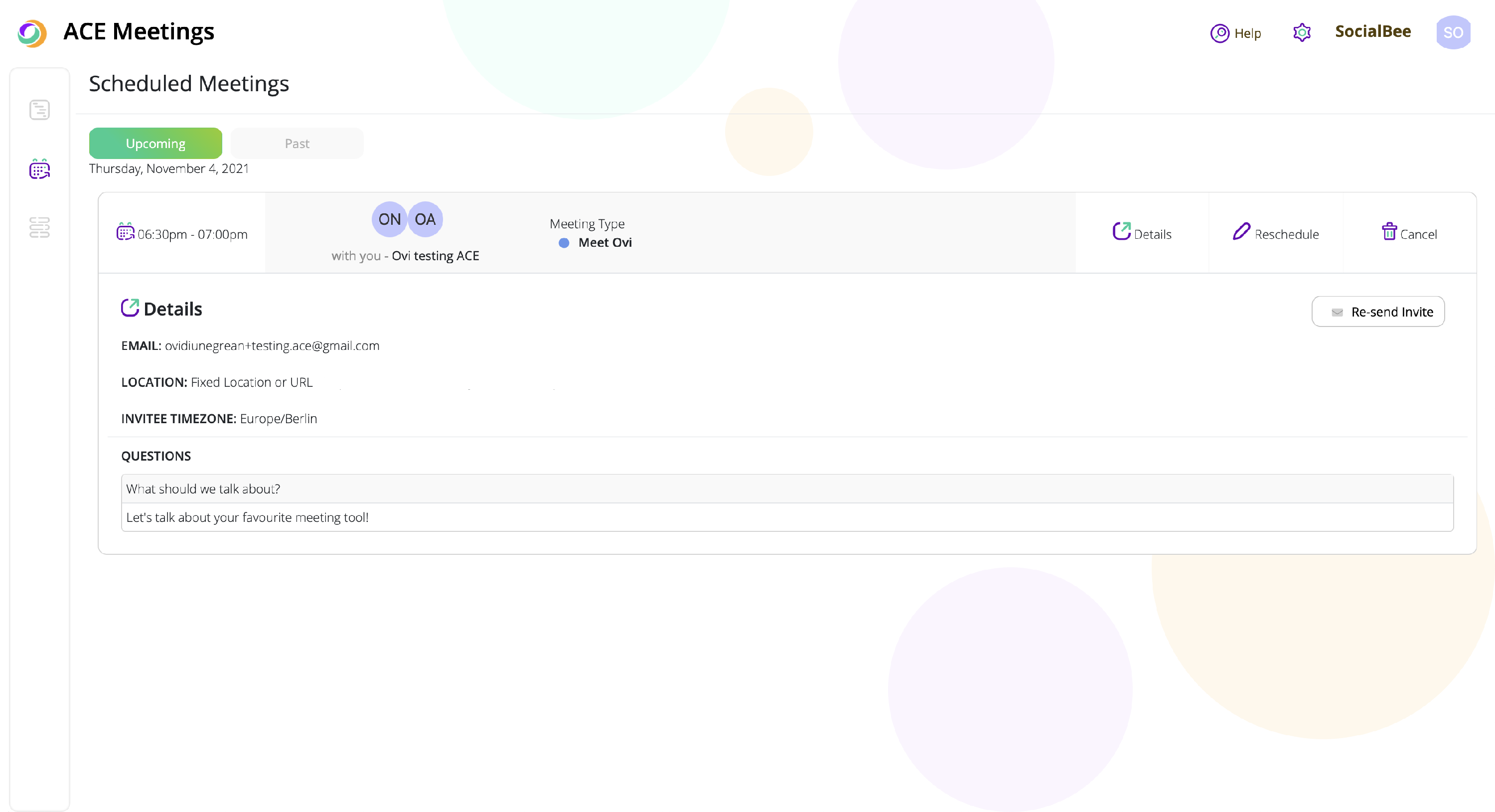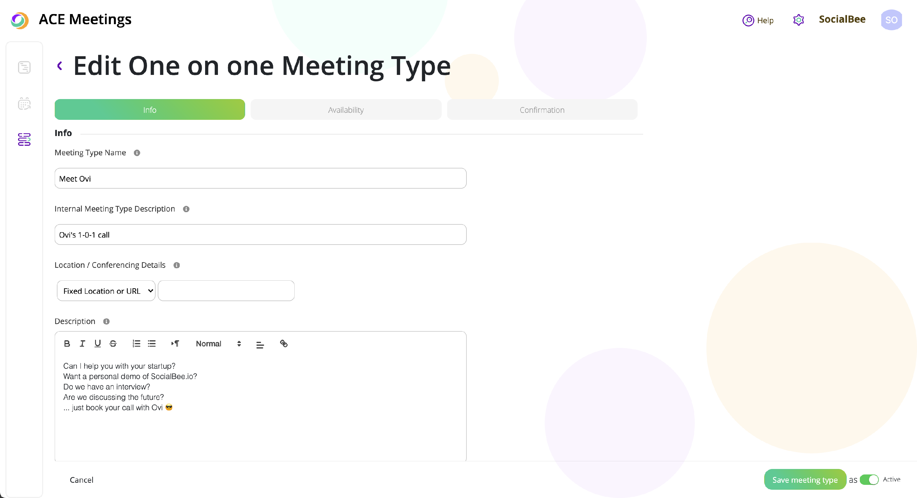 When creating a new meeting type you get full control over it - change the name and description of your meeting, set up the location that will be used (whether physical or virtual), and create availability based on each user’s timezone.