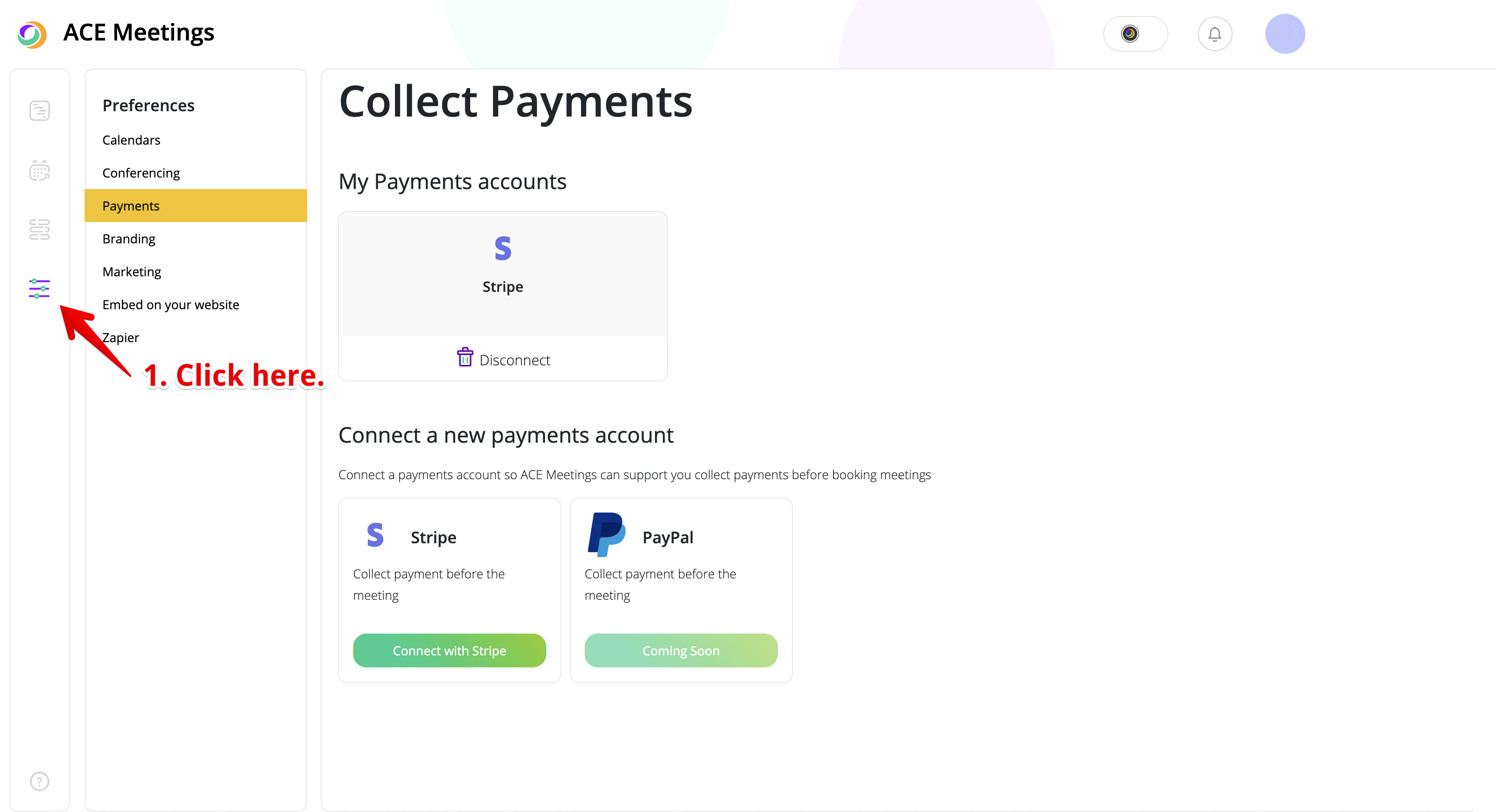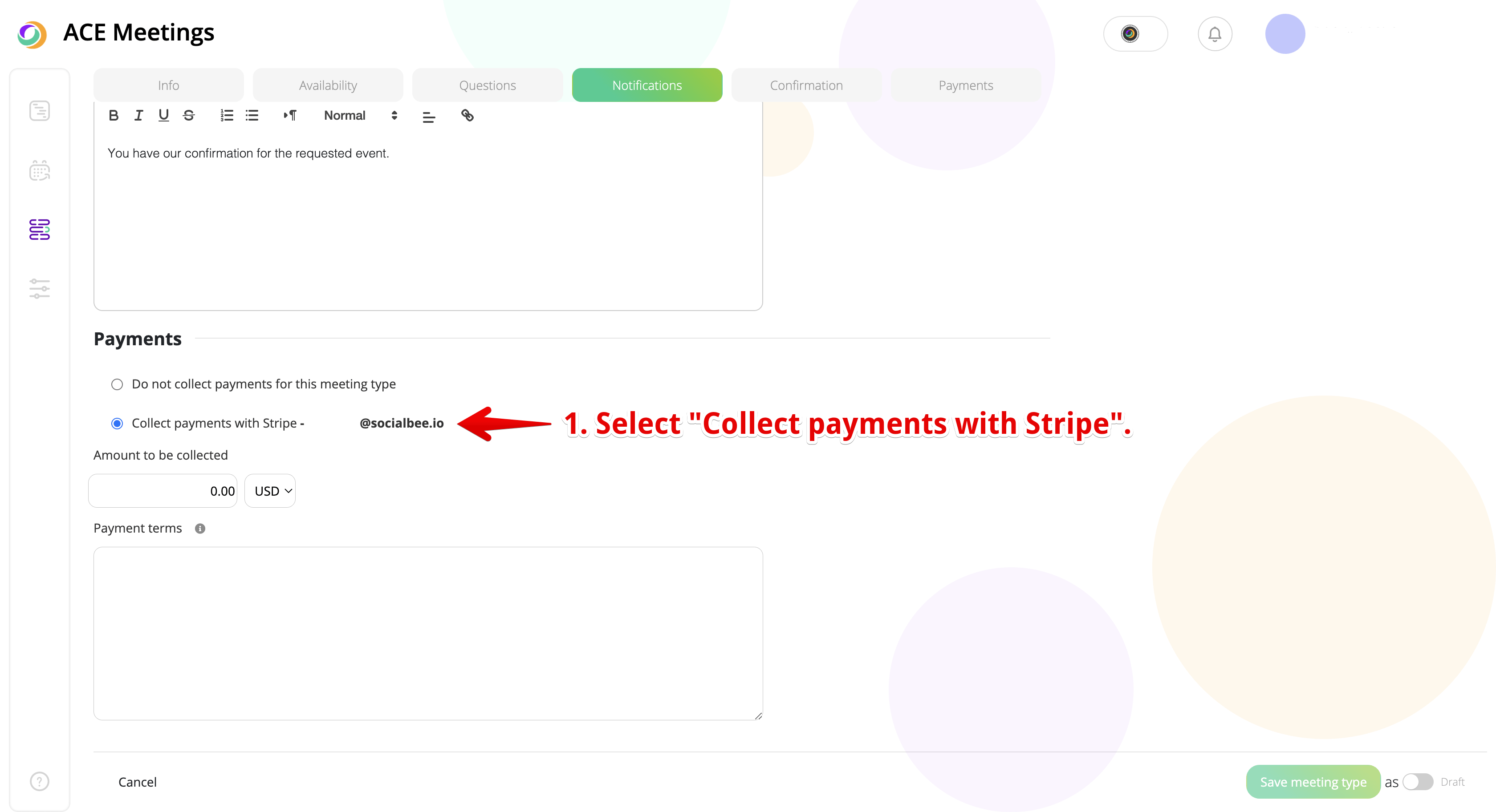 Once you have a Stripe account connected to your ACE Meetings account, you can edit – or create – a new meeting type asking for a payment. In the Meeting Type menu, scroll all the way to the bottom, where you need to follow 3 quick steps: