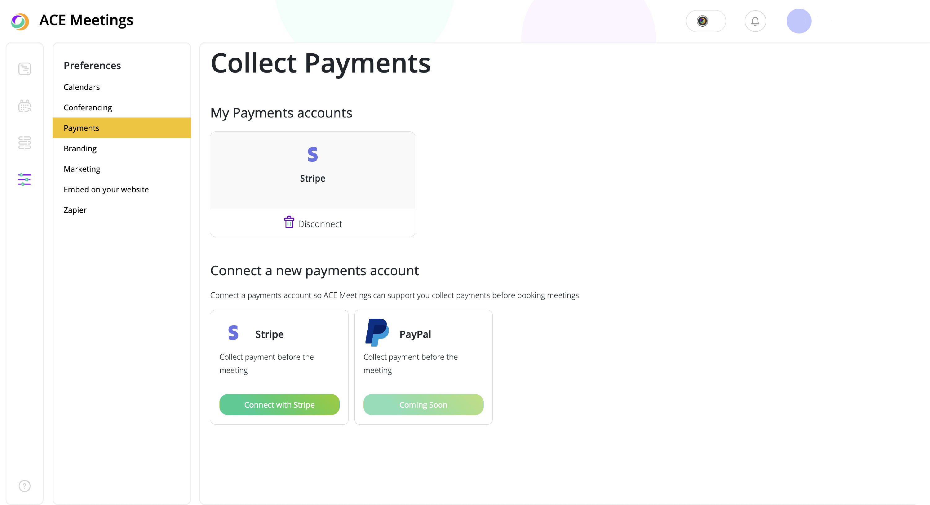 In order to set up your paid-for meetings, you will first need to set up a payment solution. The first step is to go to your Settings, from the left-side menu, then click on the Payments tab.