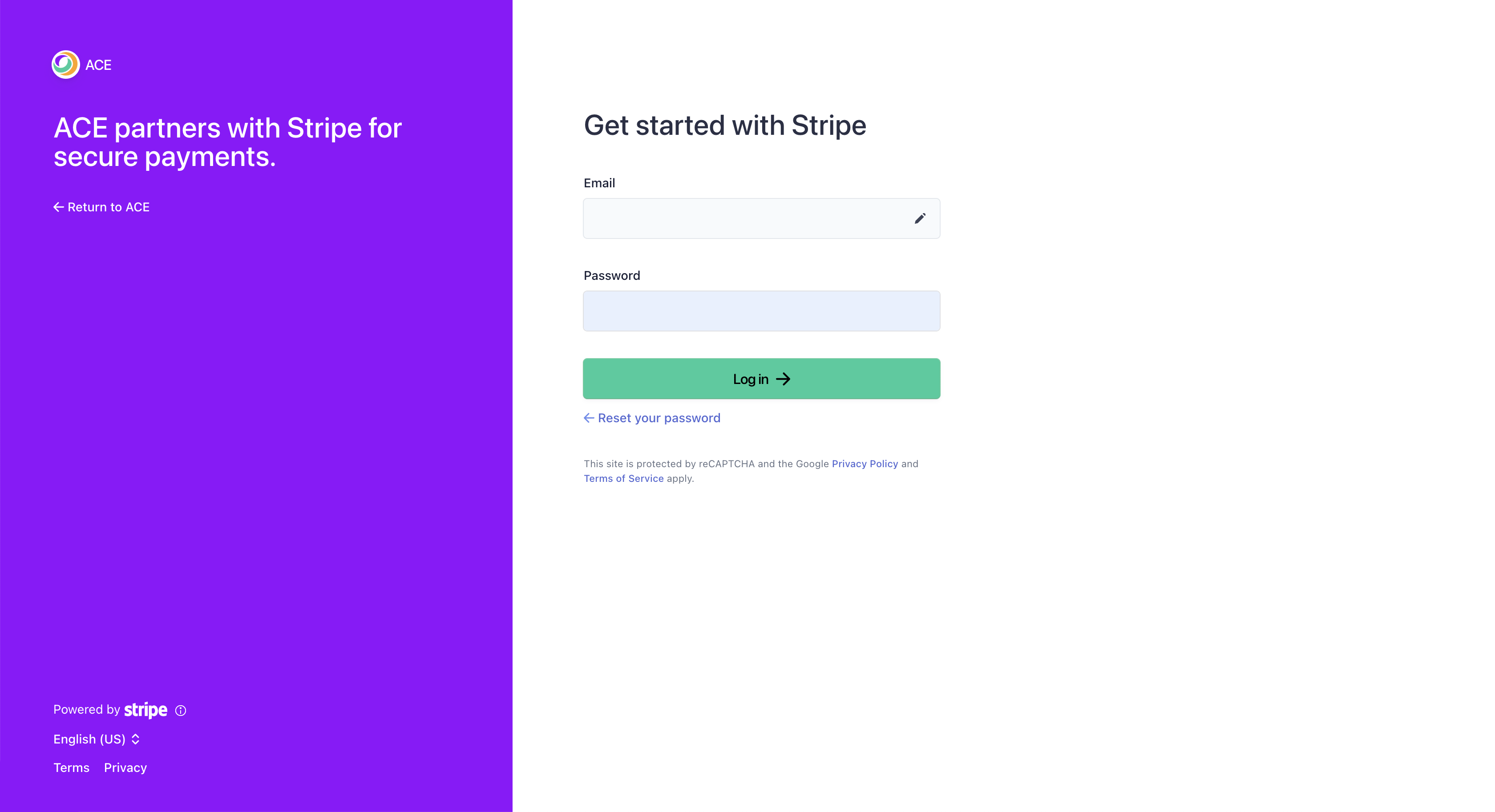 Once you did that, you will be redirected to our partner page with Stripe. Log into your account following the right steps and select the business you want to use for your ACE Meetings account.