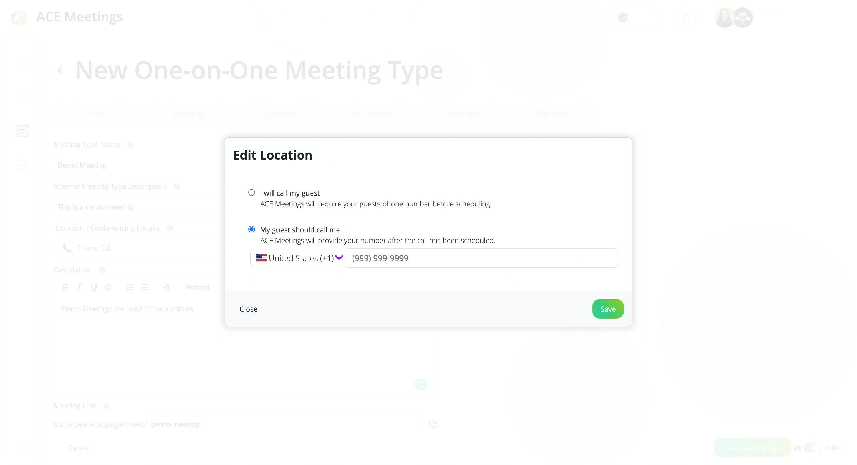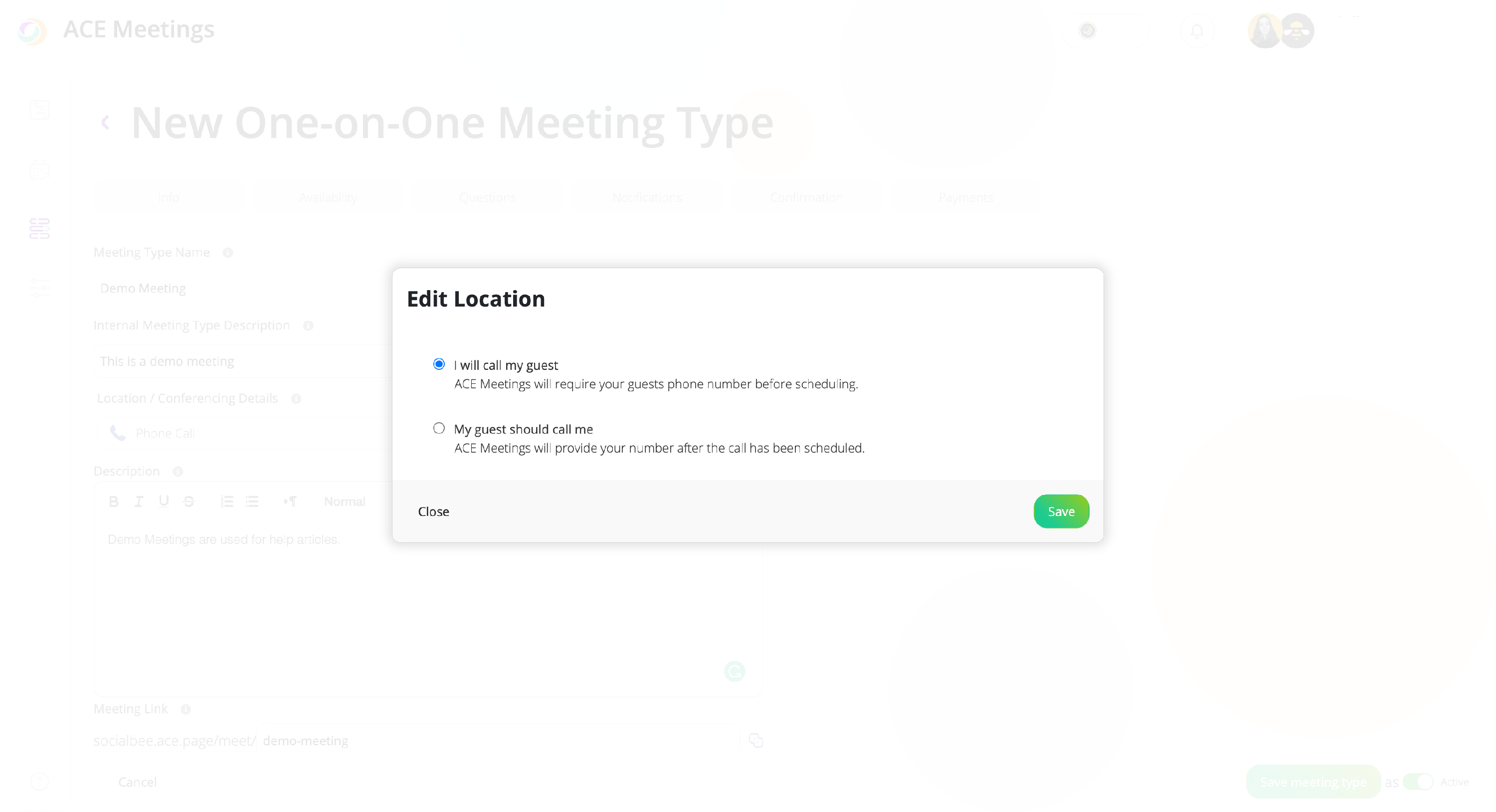 If you want to call or be called by your clients when a meeting is booked, this can be easily achieved within ACE Meetings by changing your meeting location. So, you can have one-on-one or round-robin that are handled through phone calls.