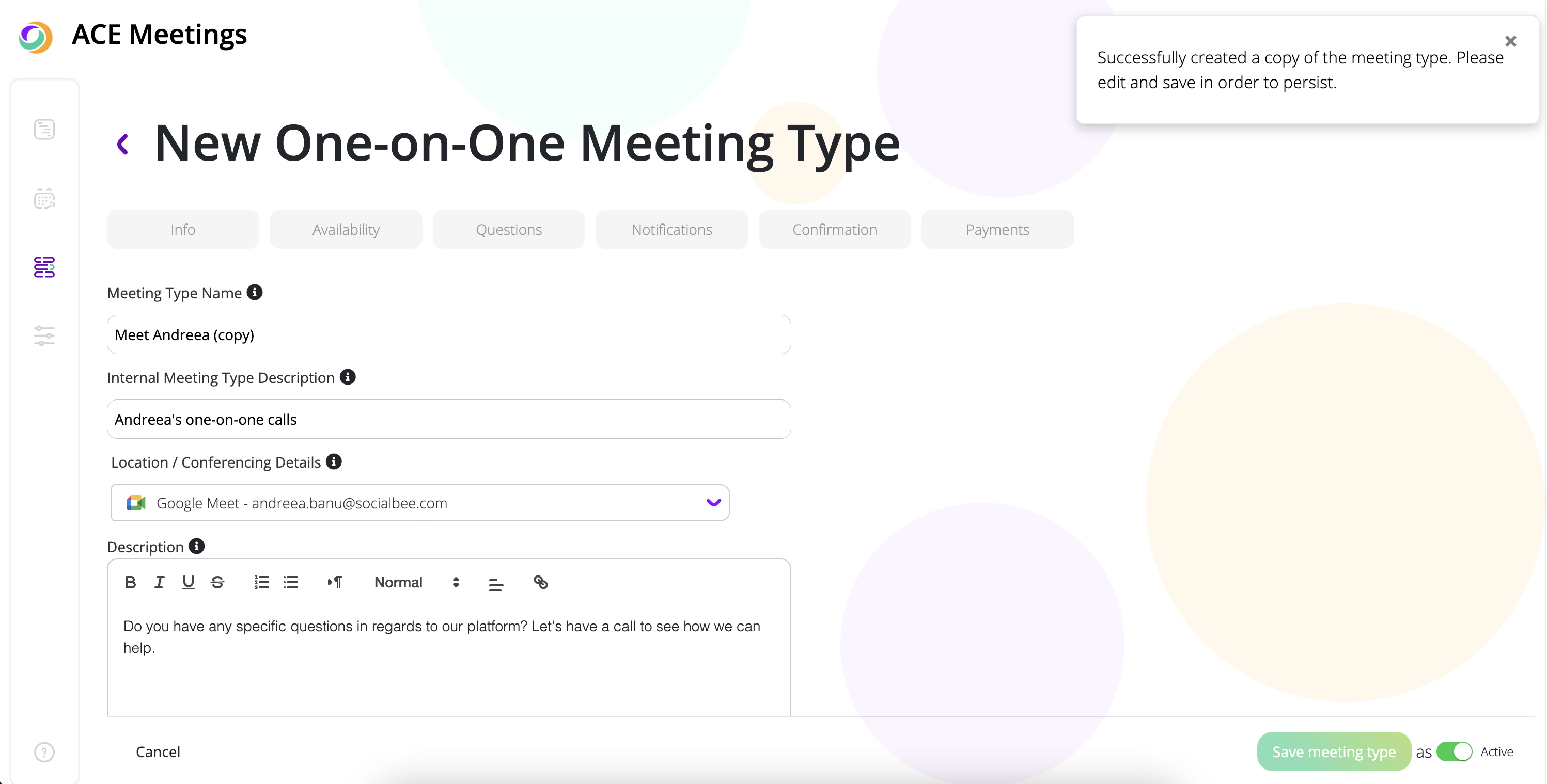 Once you click on "Duplicate", a new meeting type with the same settings will be created. Now, you can edit the new meeting type.